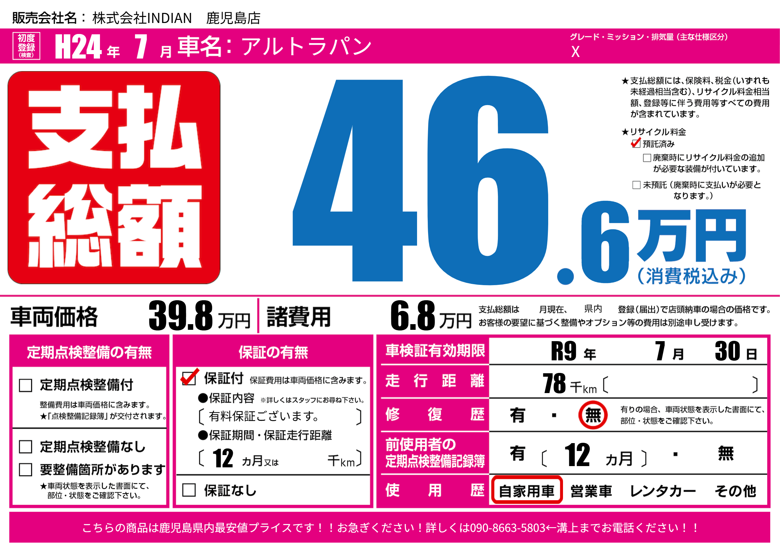 | 走行キロ | 7.8万km | 初年度登録 | H24年7月 |