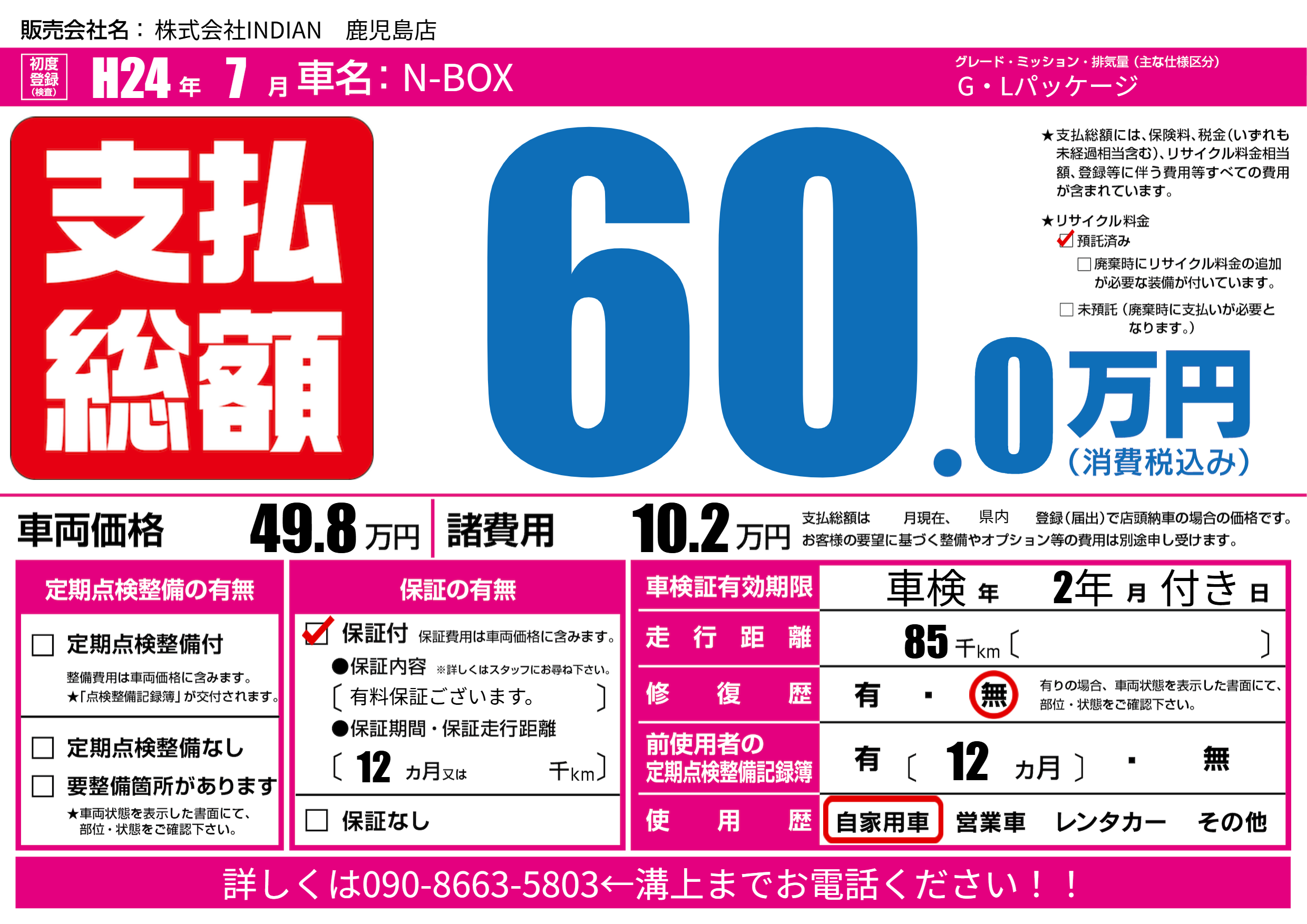 | 走行キロ | 8.5万km | 初年度登録 | H24年7月 |