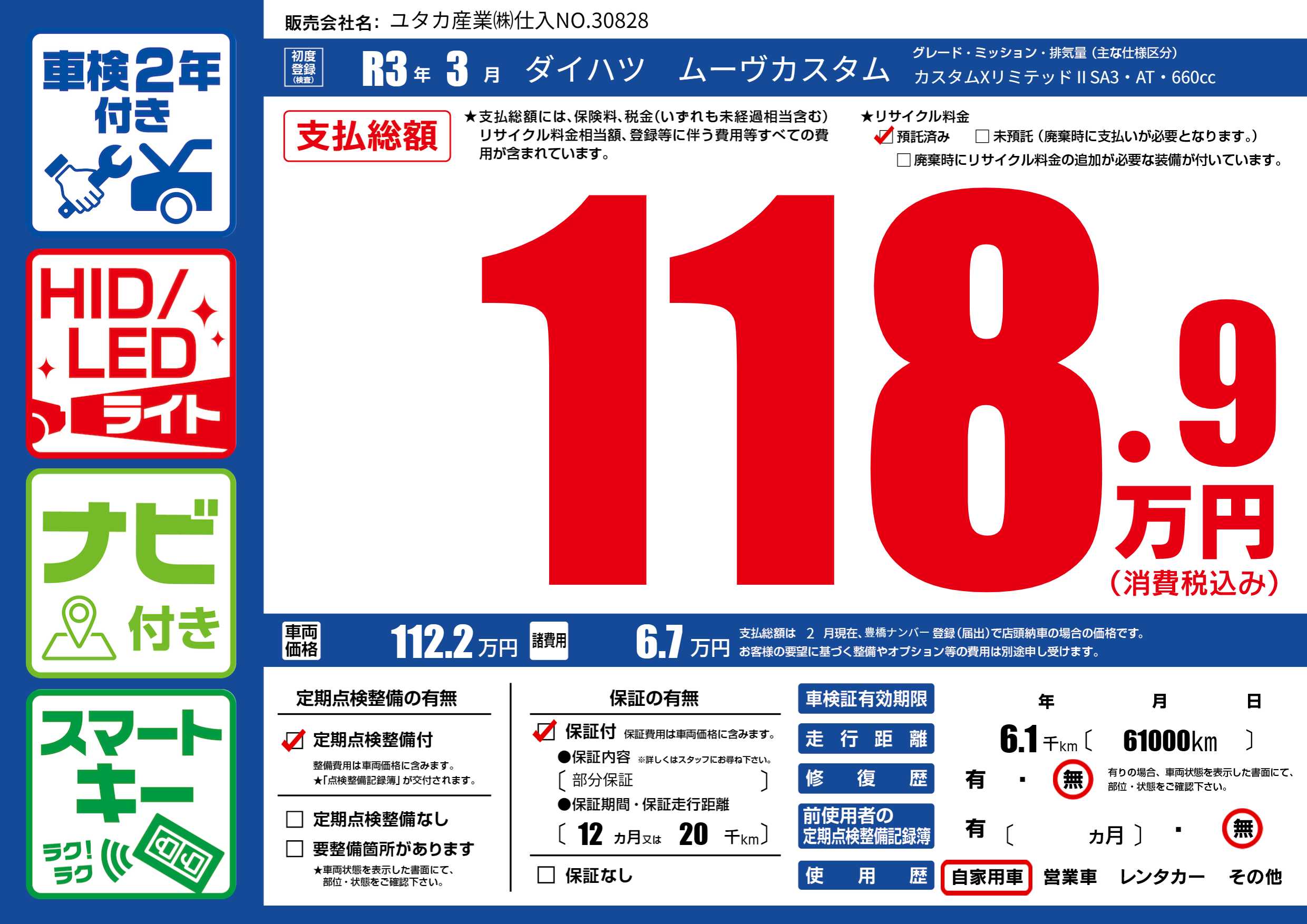 | 走行キロ | 0.6万km | 初年度登録 | R3年3月 |