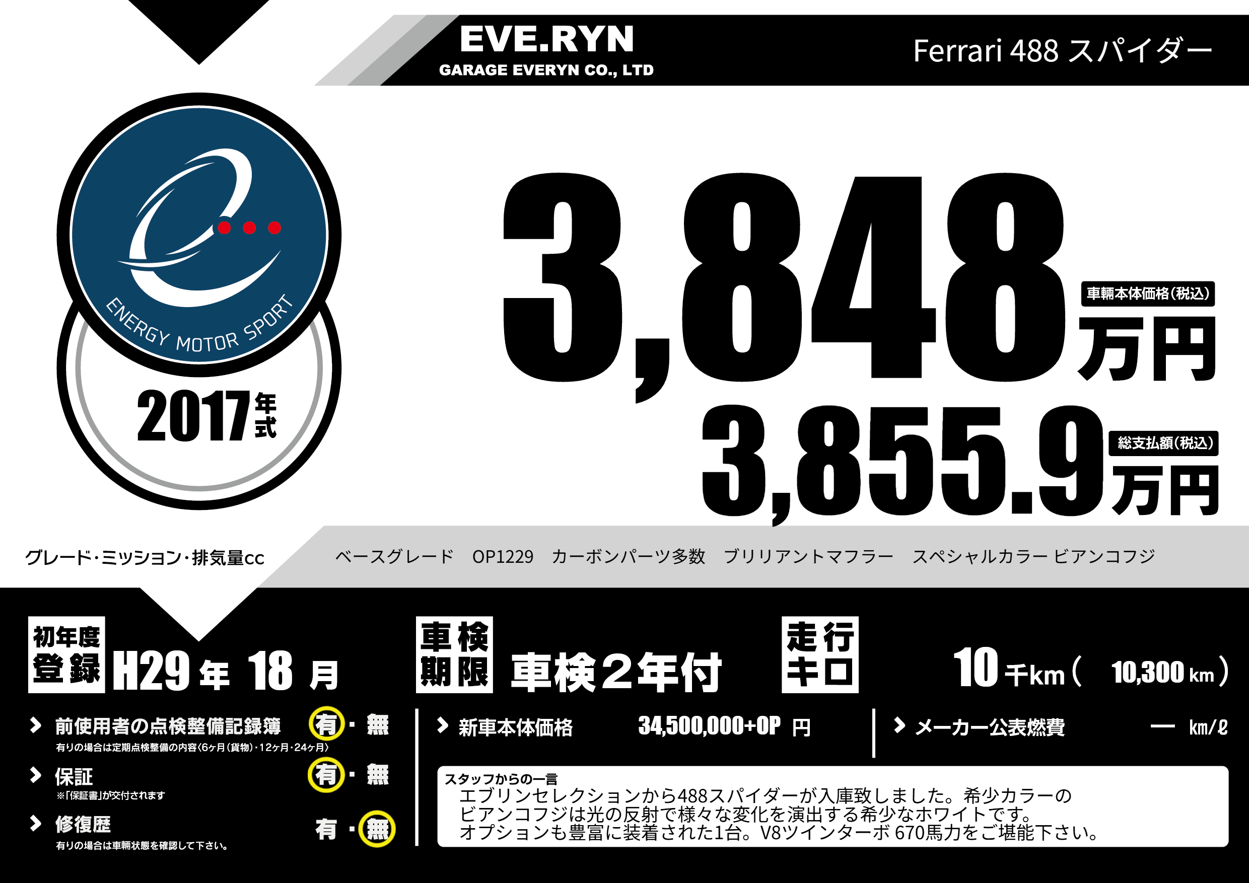 | 車名 | Ferrari 488 スパイダー | グレード ミッション 排気量 |