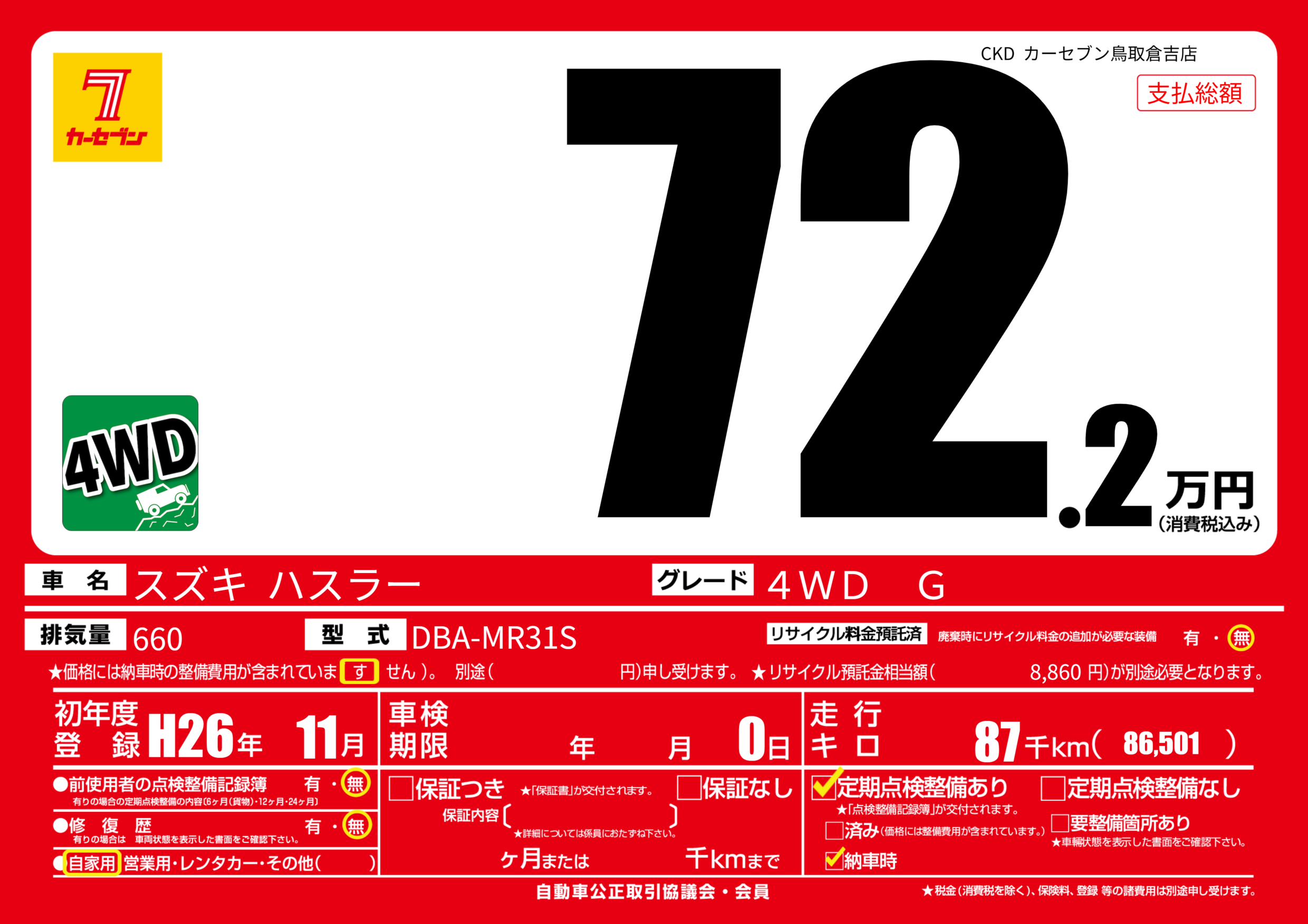 | 走行キロ | 8.7万km | 初年度登録 | H26年11月 |