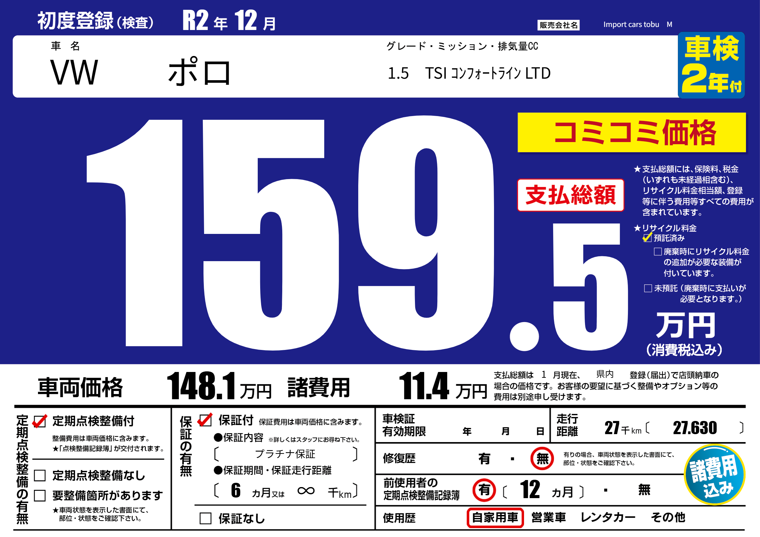 | 車名 | VW ポロ | グレード ミッション 排気量 |