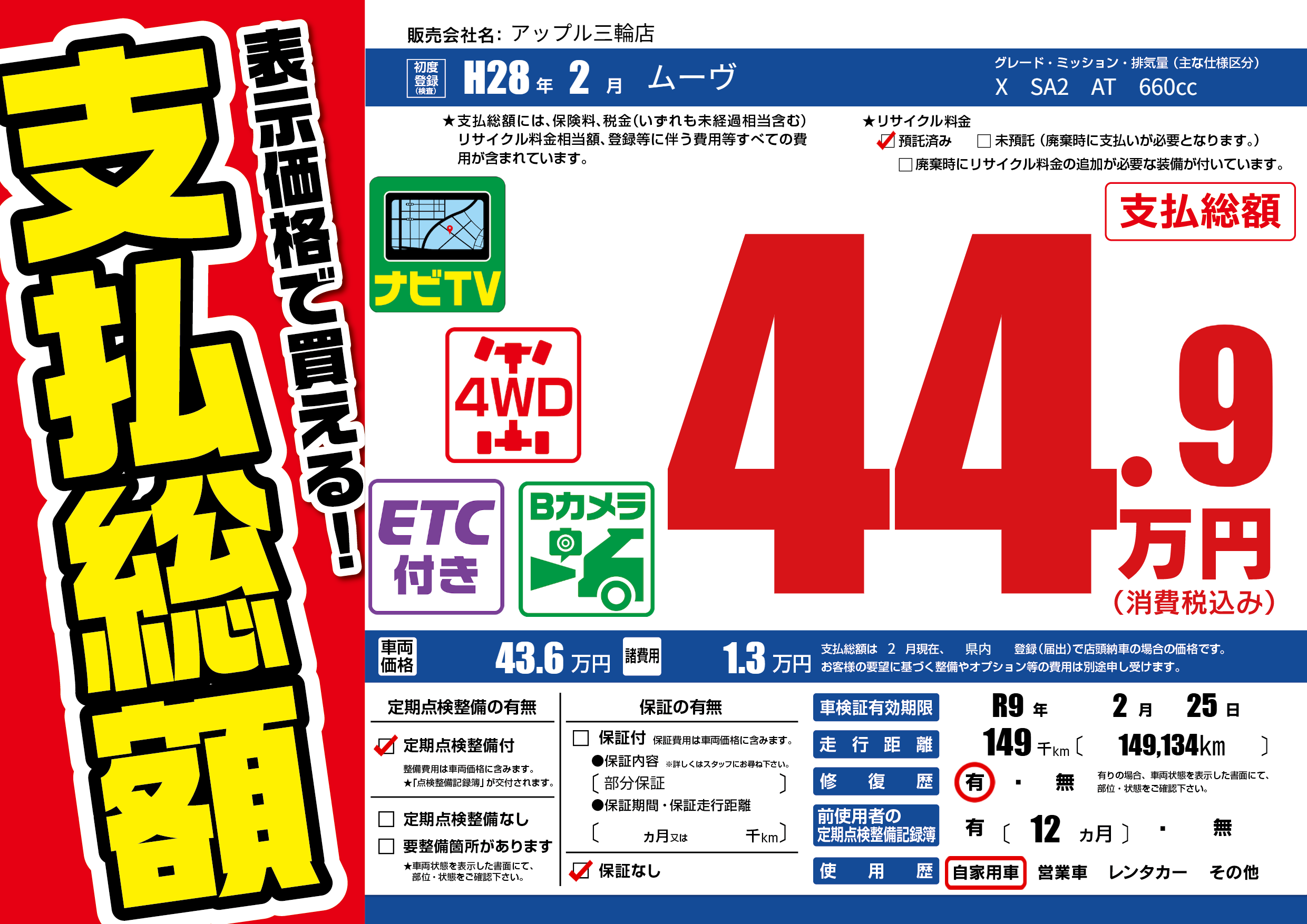 | 走行キロ | 14.9万km | 初年度登録 | H28年2月 |