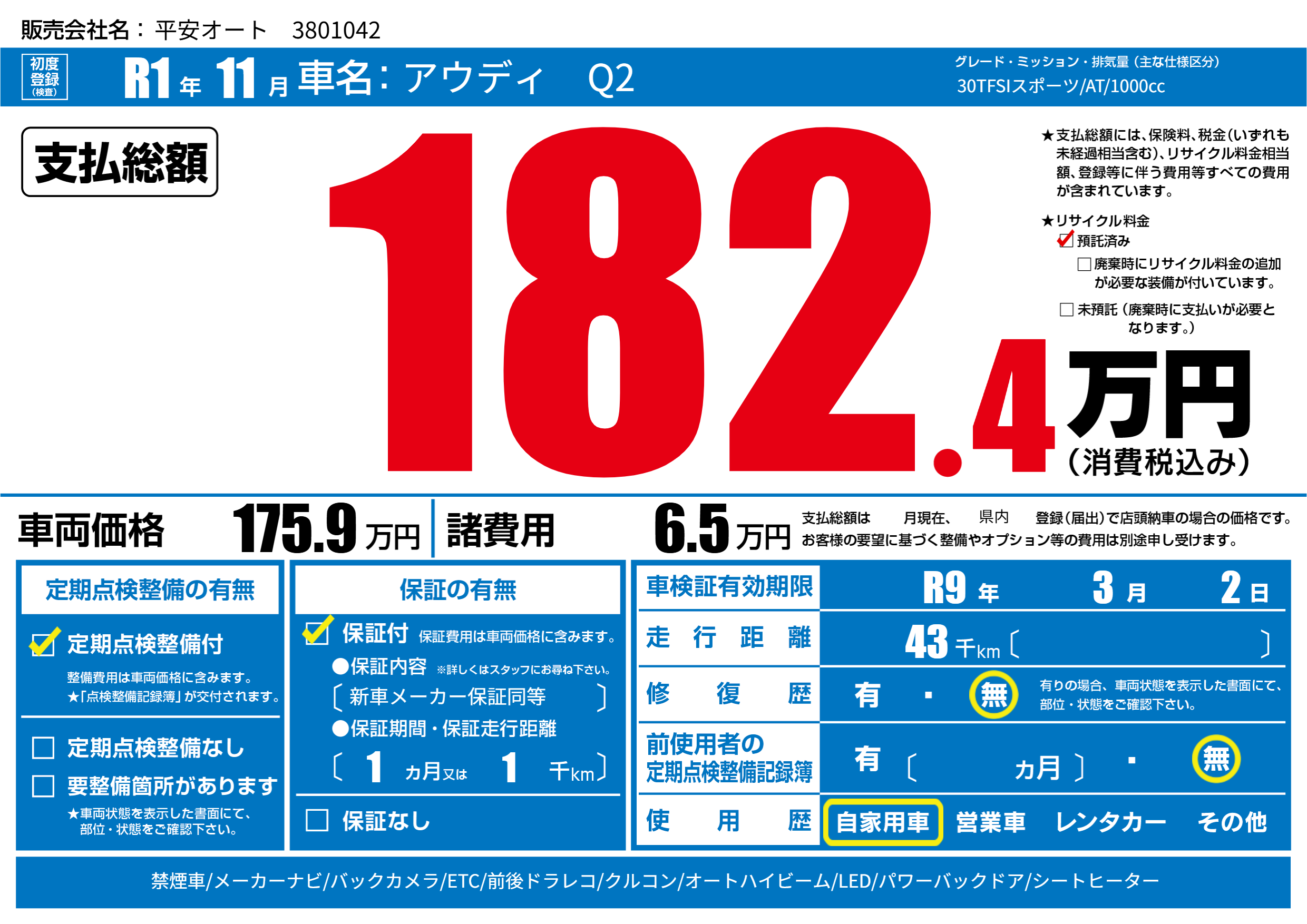 | 車名 | アウディ Q2 | グレード ミッション 排気量 |