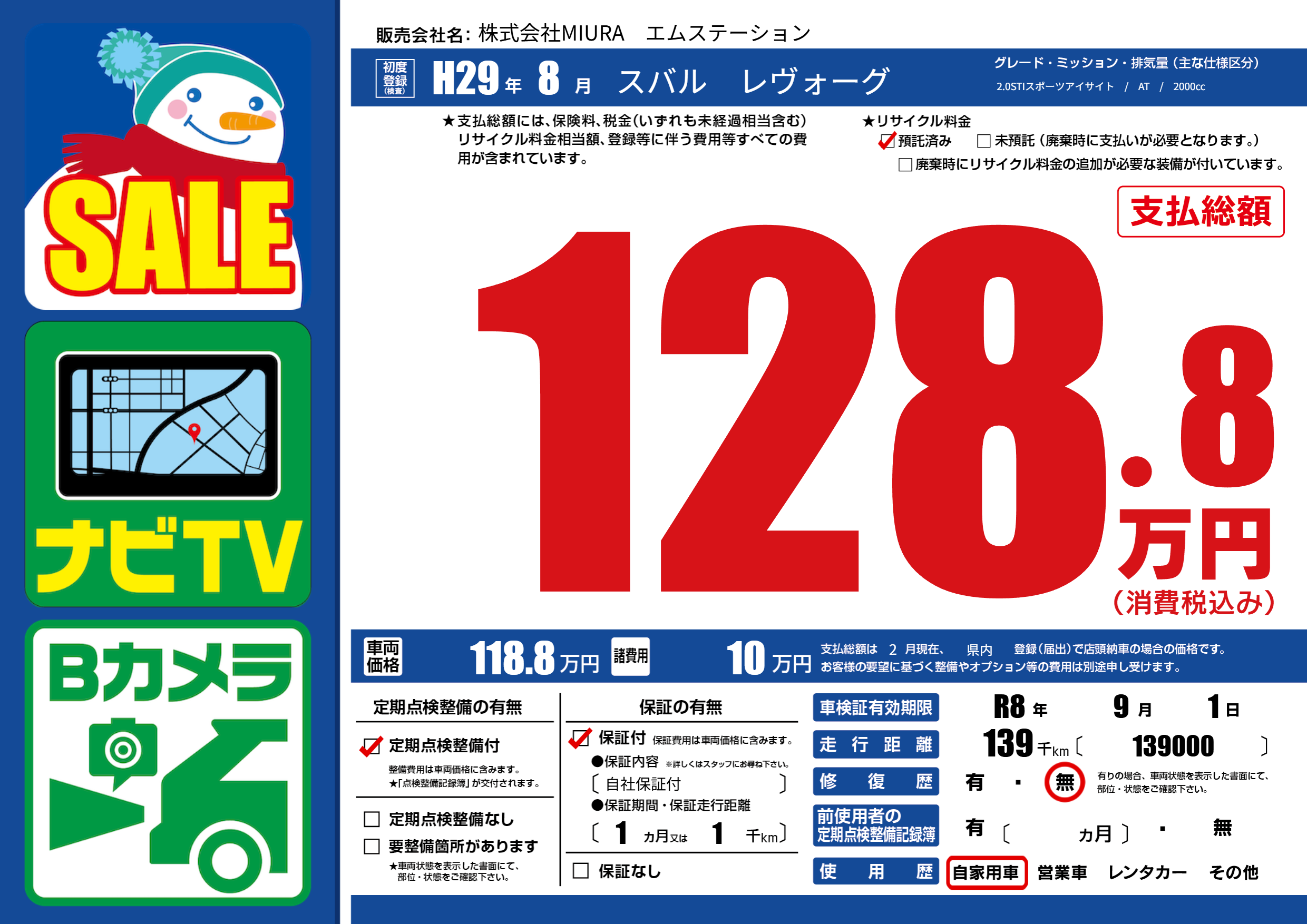 | 車検制限 | R8年 9月 1日 | ||