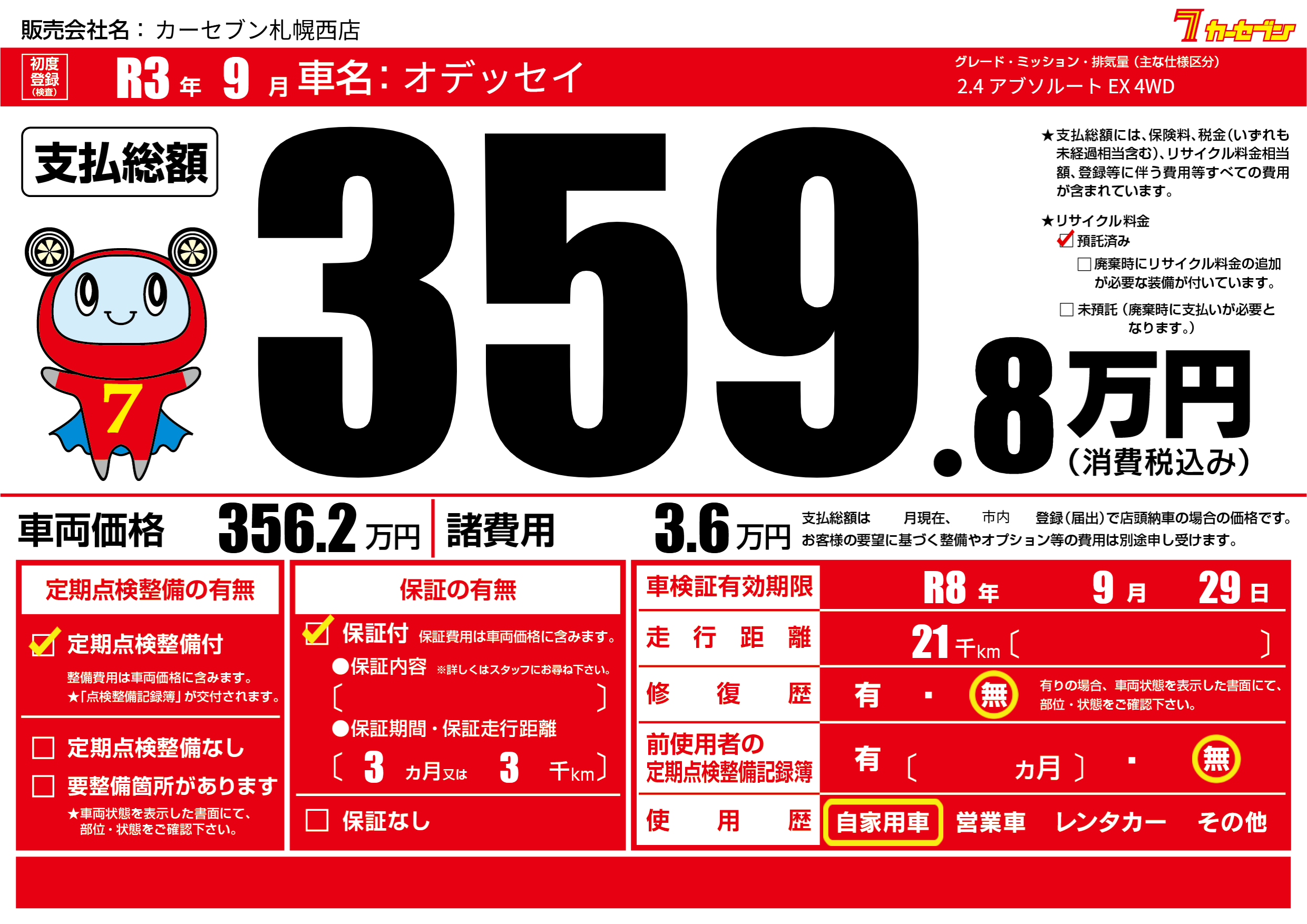 | 走行キロ | 2.1万km | 初年度登録 | R3年9月 |