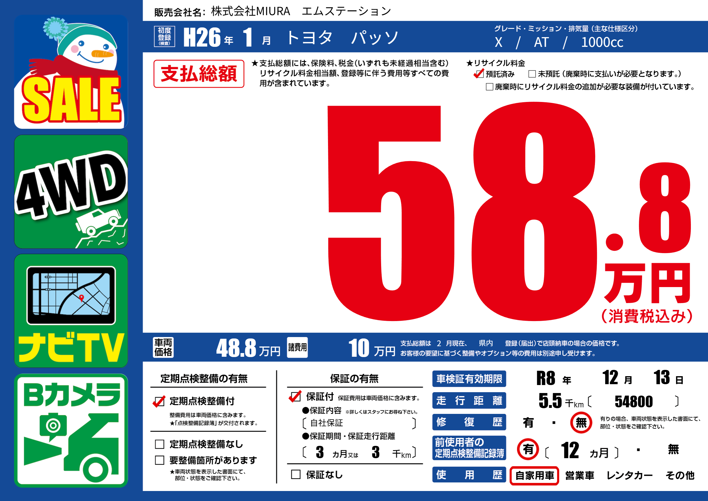 | 車名 | トヨタ パッソ | グレード ミッション 排気量 |