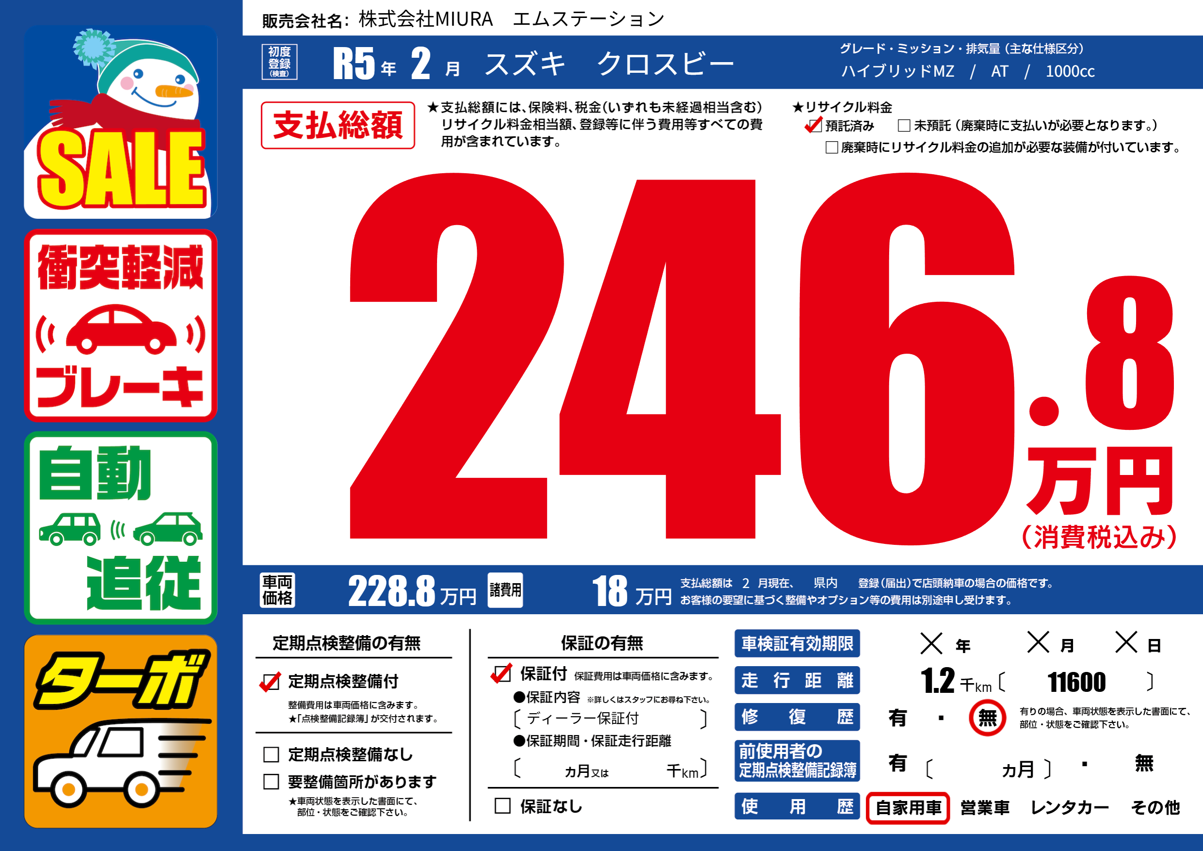 | 走行キロ | 0.1万km | 初年度登録 | R5年2月 |