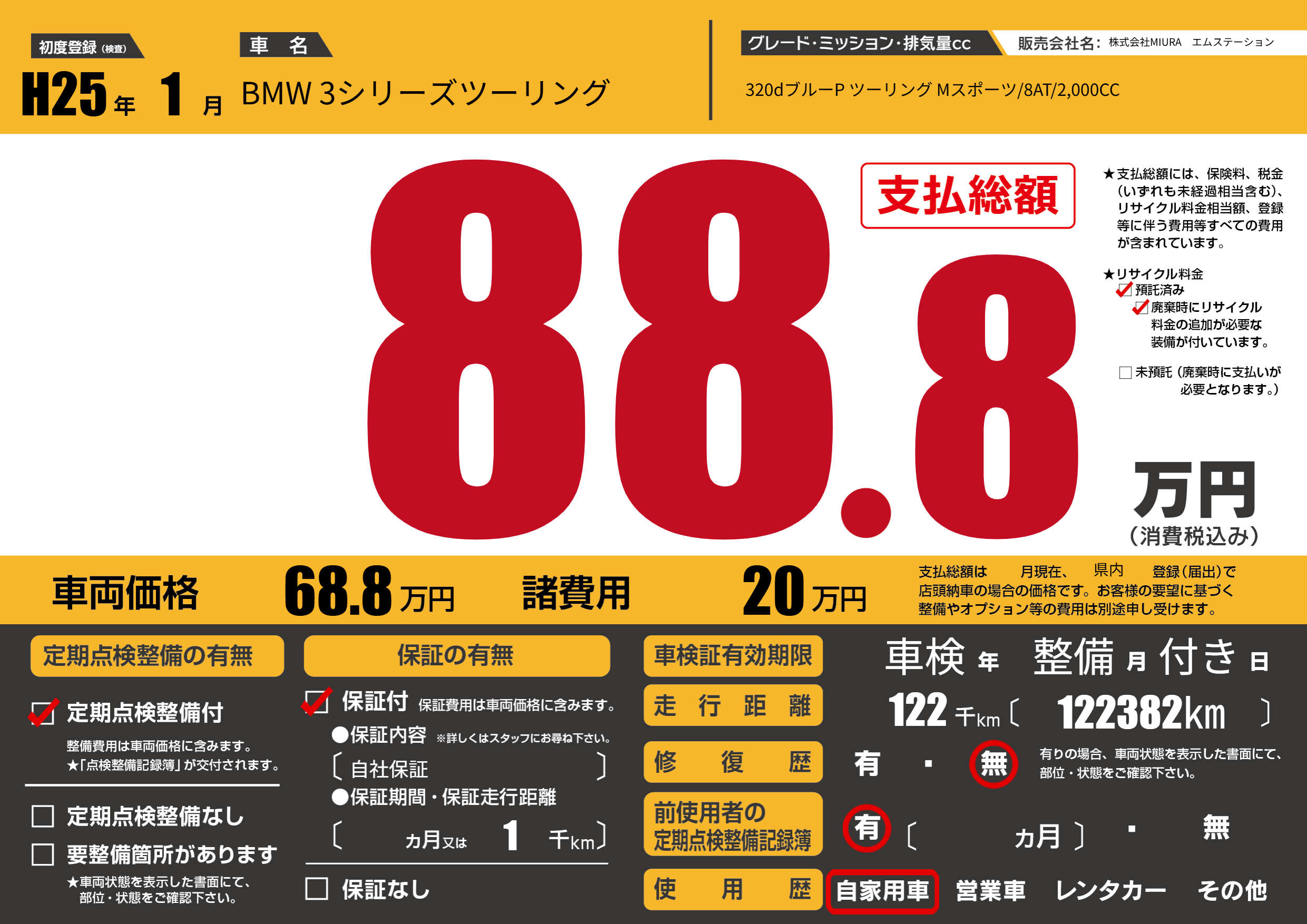 | 車名 | BMW 3シリーズツーリング | グレード ミッション 排気量 |