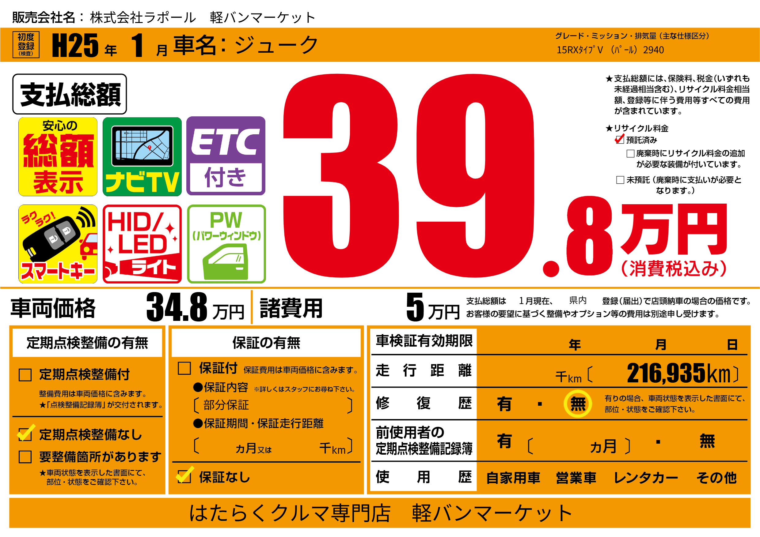 あり | リサイクル預託金相当額 | ( 0円)が別途必要 |