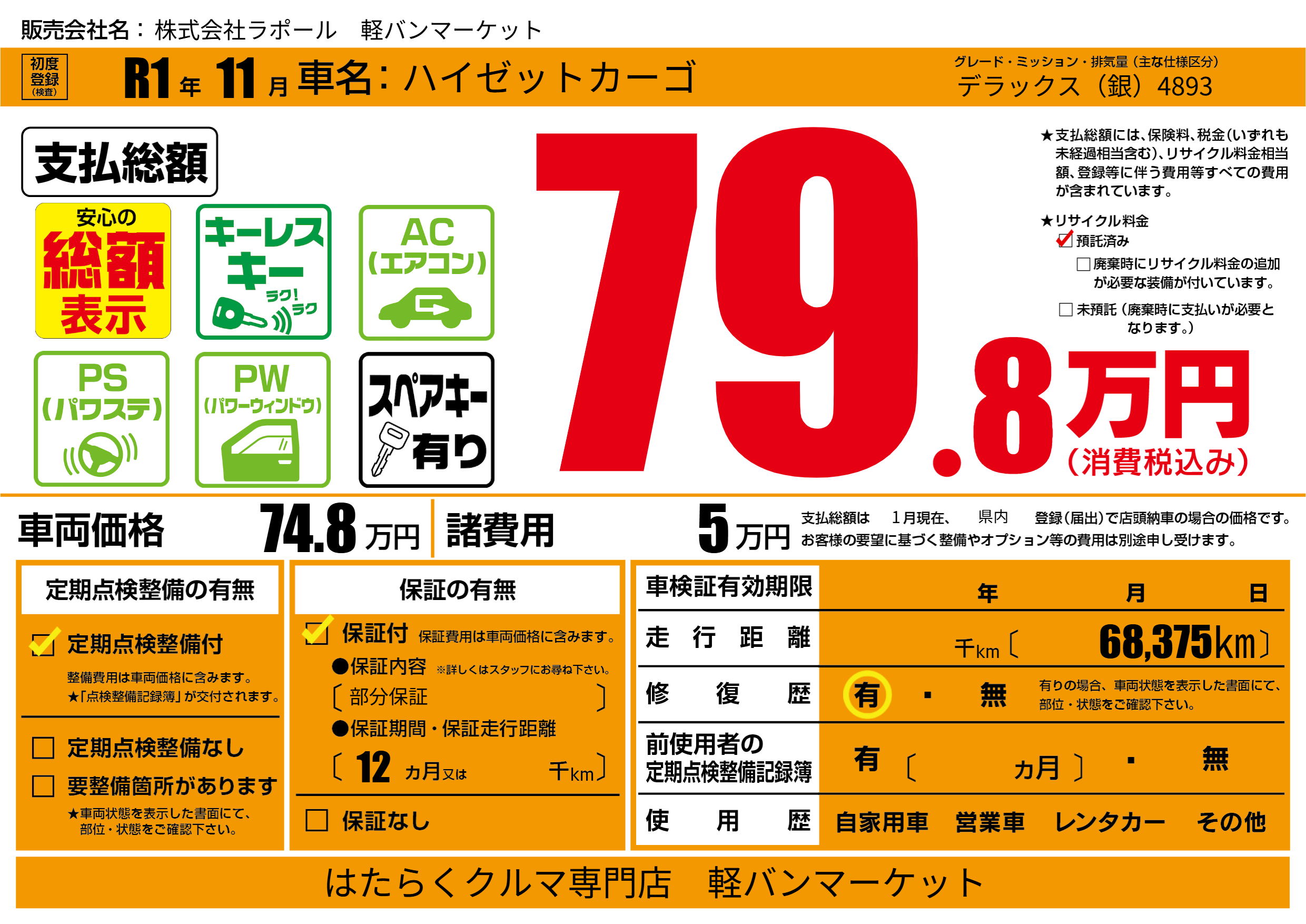 保証付き 保証内容(部分保証) 12ヶ月または()千kmまで |