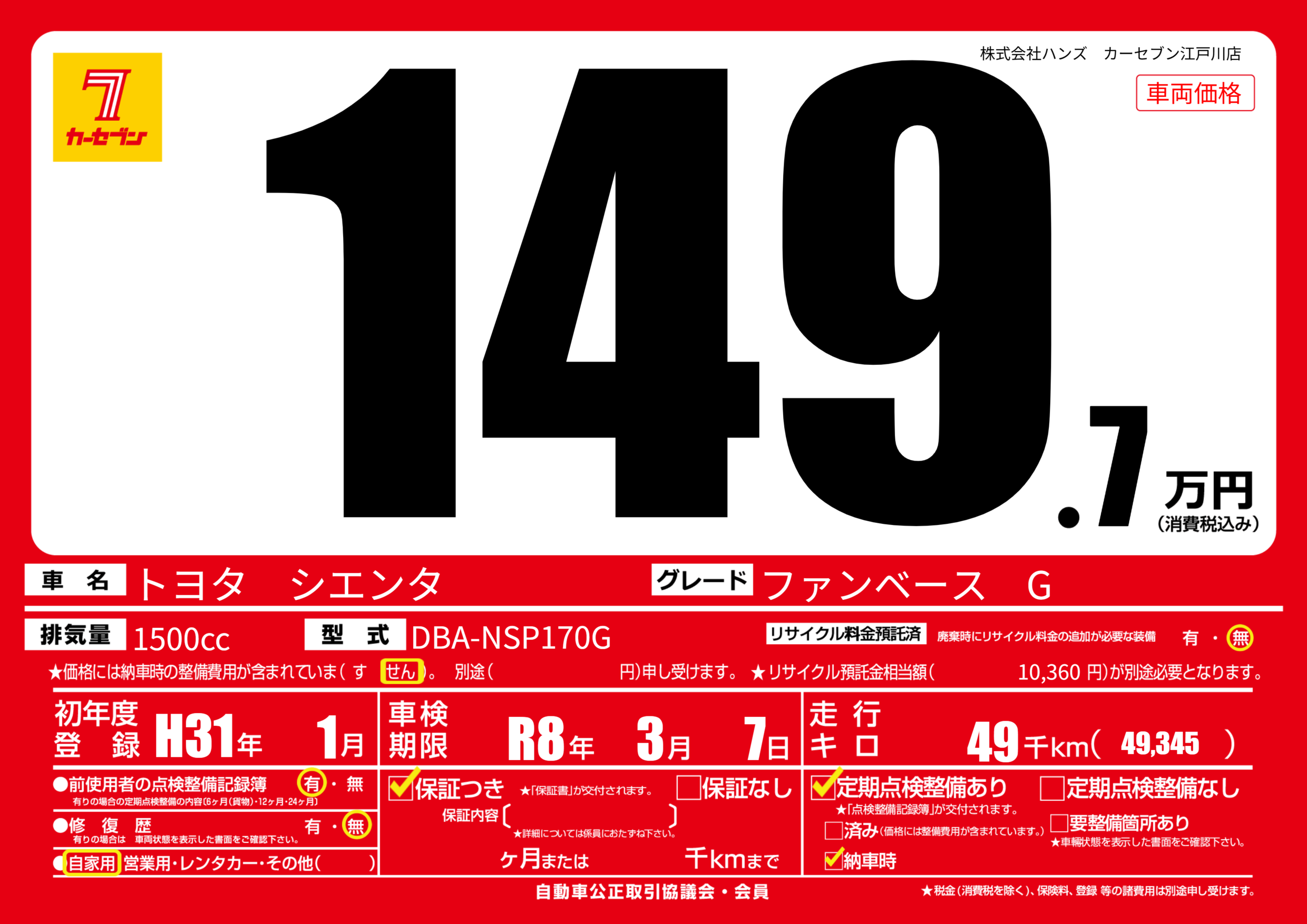 | 車名 | トヨタ シエンタ | グレード ミッション 排気量 |