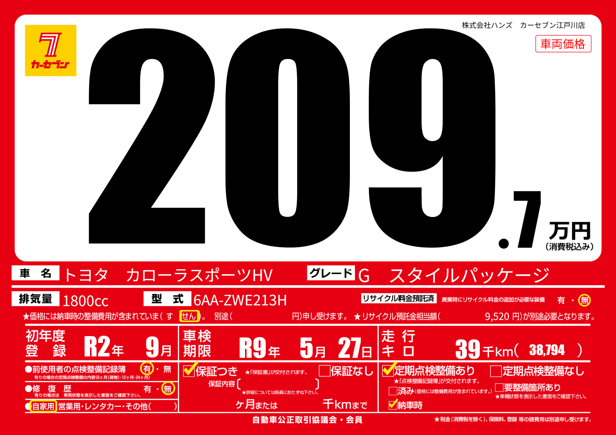 | 車名 | トヨタ カローラスポーツHV | グレード ミッション 排気量 |