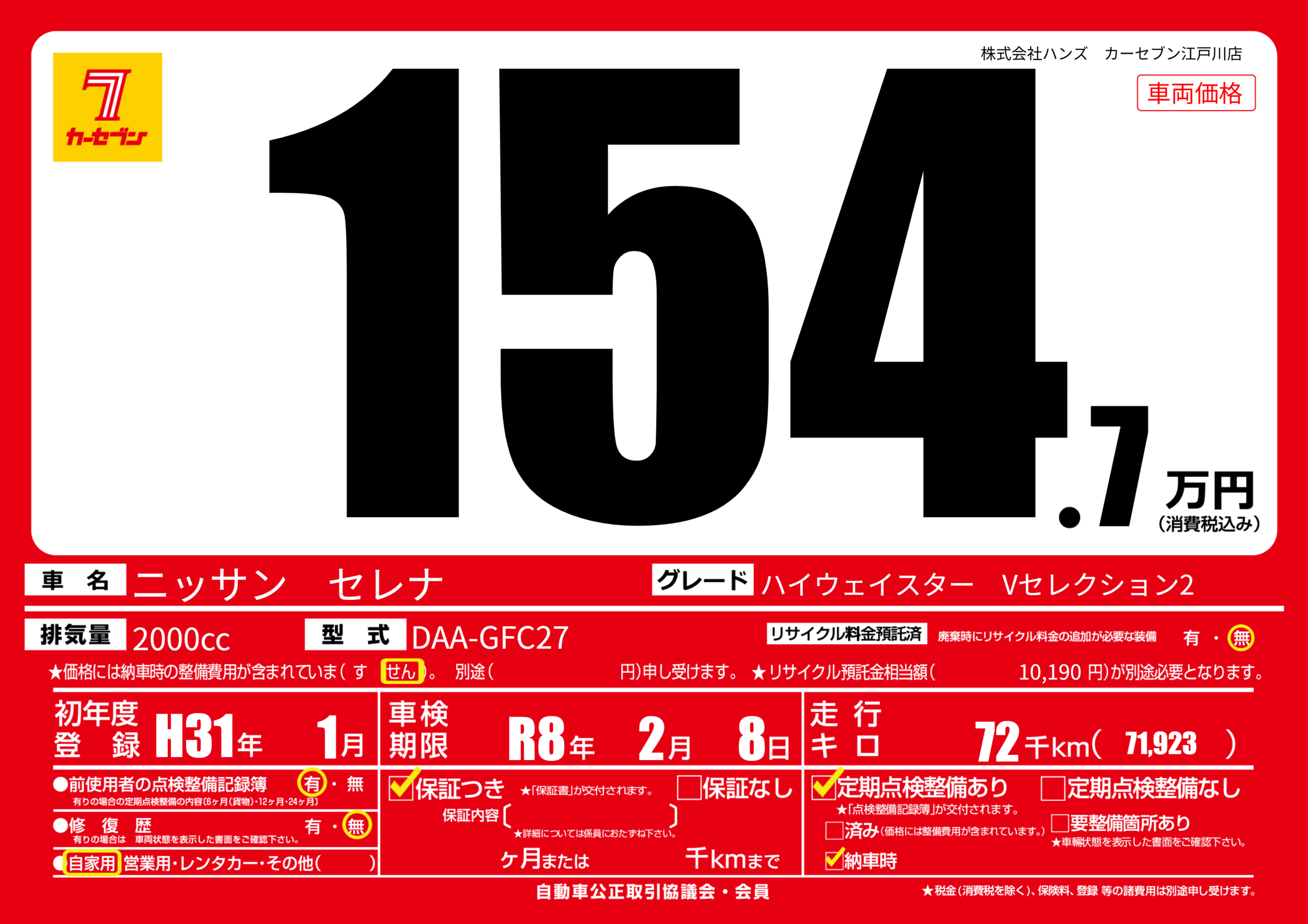 | 車名 | ニッサン セレナ | グレード ミッション 排気量 |