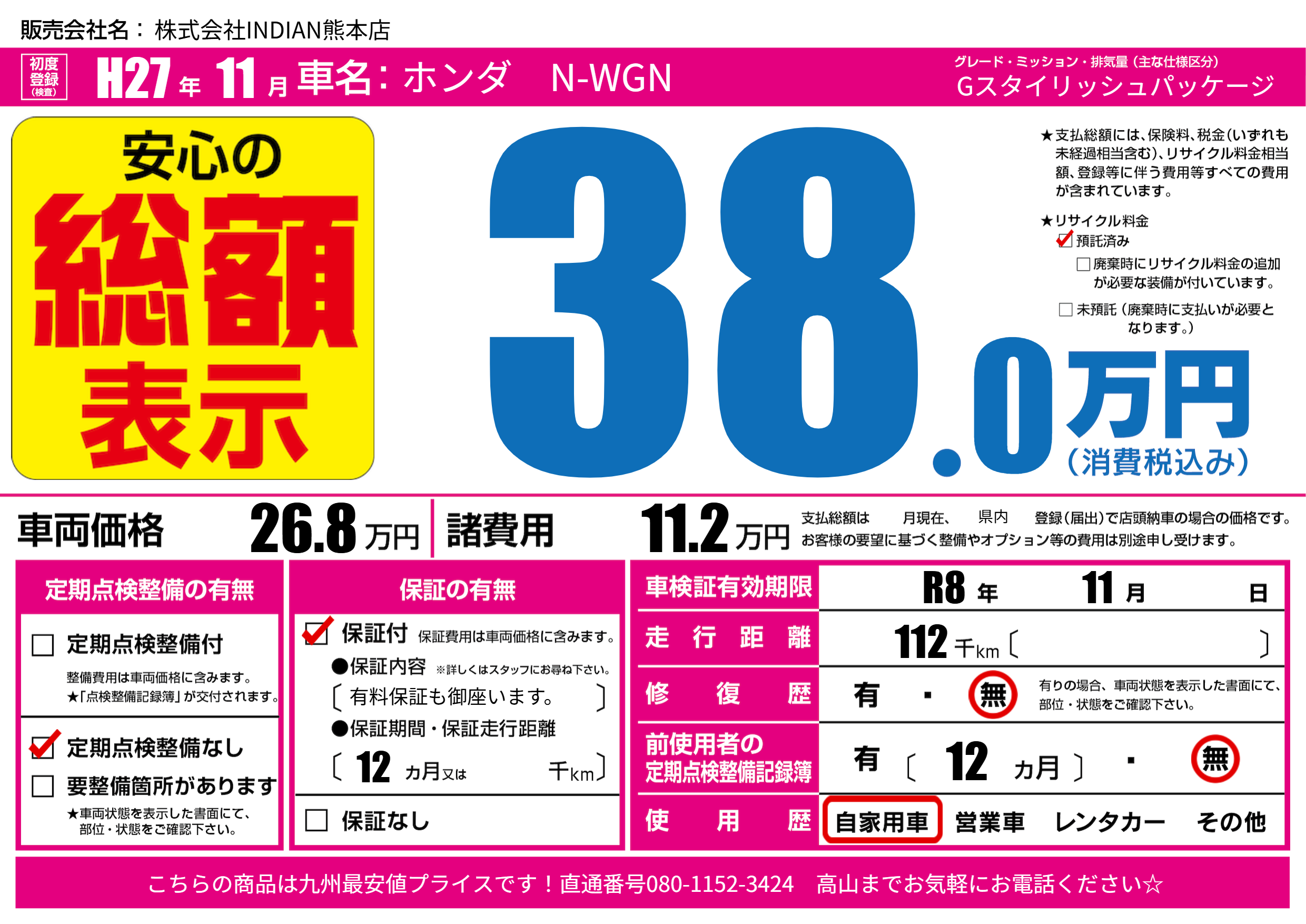 | 車検制限 | R8年 11月 - 日 | ||