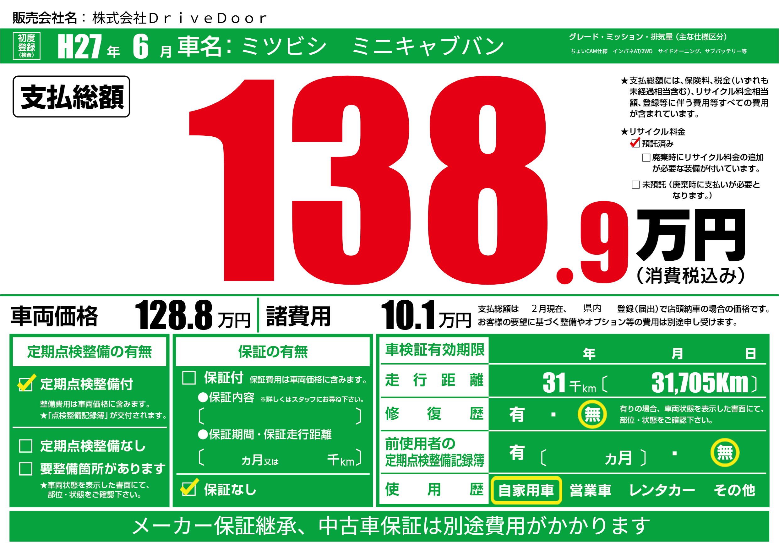| 車名 | ミツビシ ミニキャブバン | グレード ミッション 排気量 |