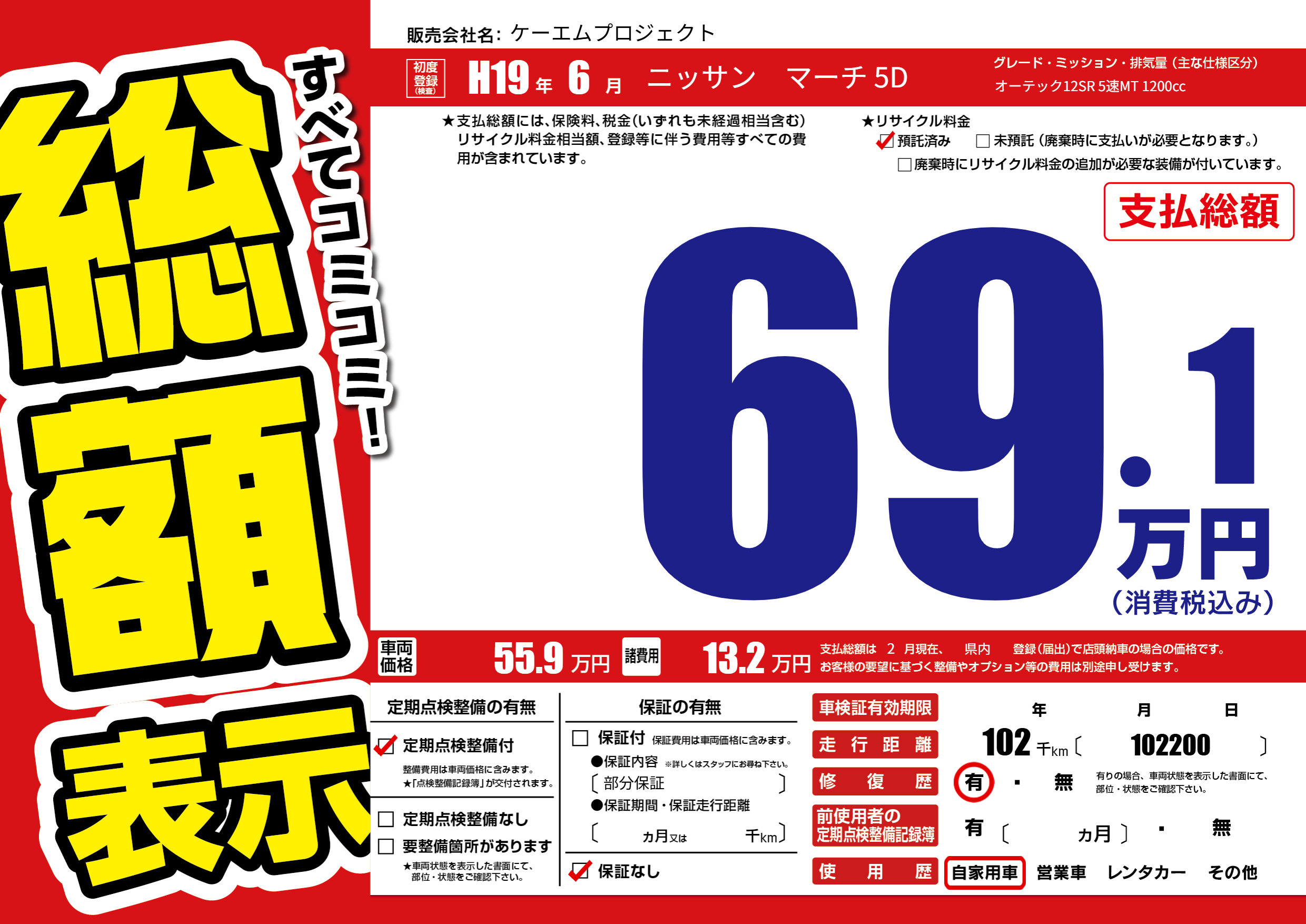 | 車名 | ニッサン マーチ 5D | グレード ミッション 排気量 |