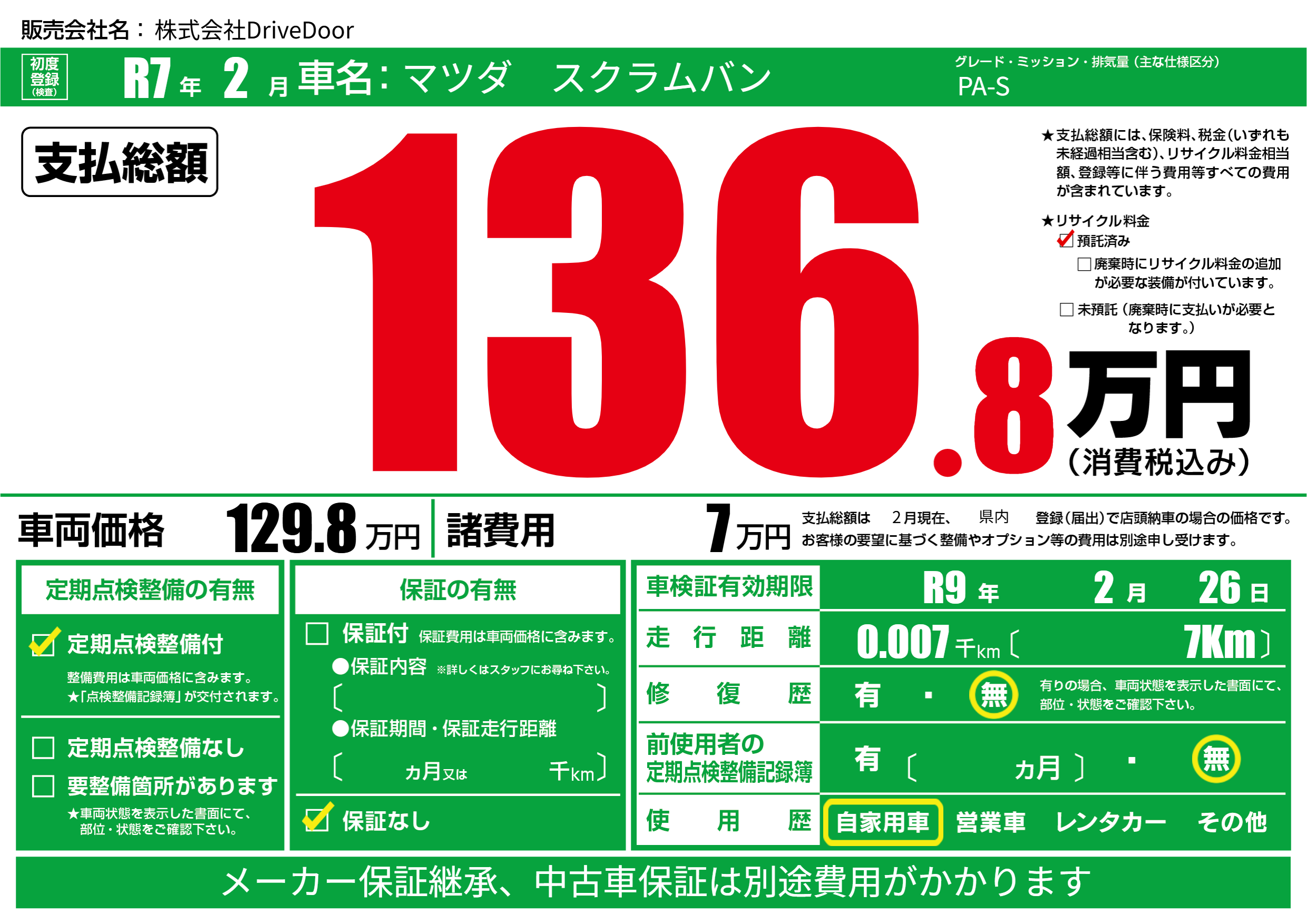 | 車検制限 | R9年 2月 26日 | ||
