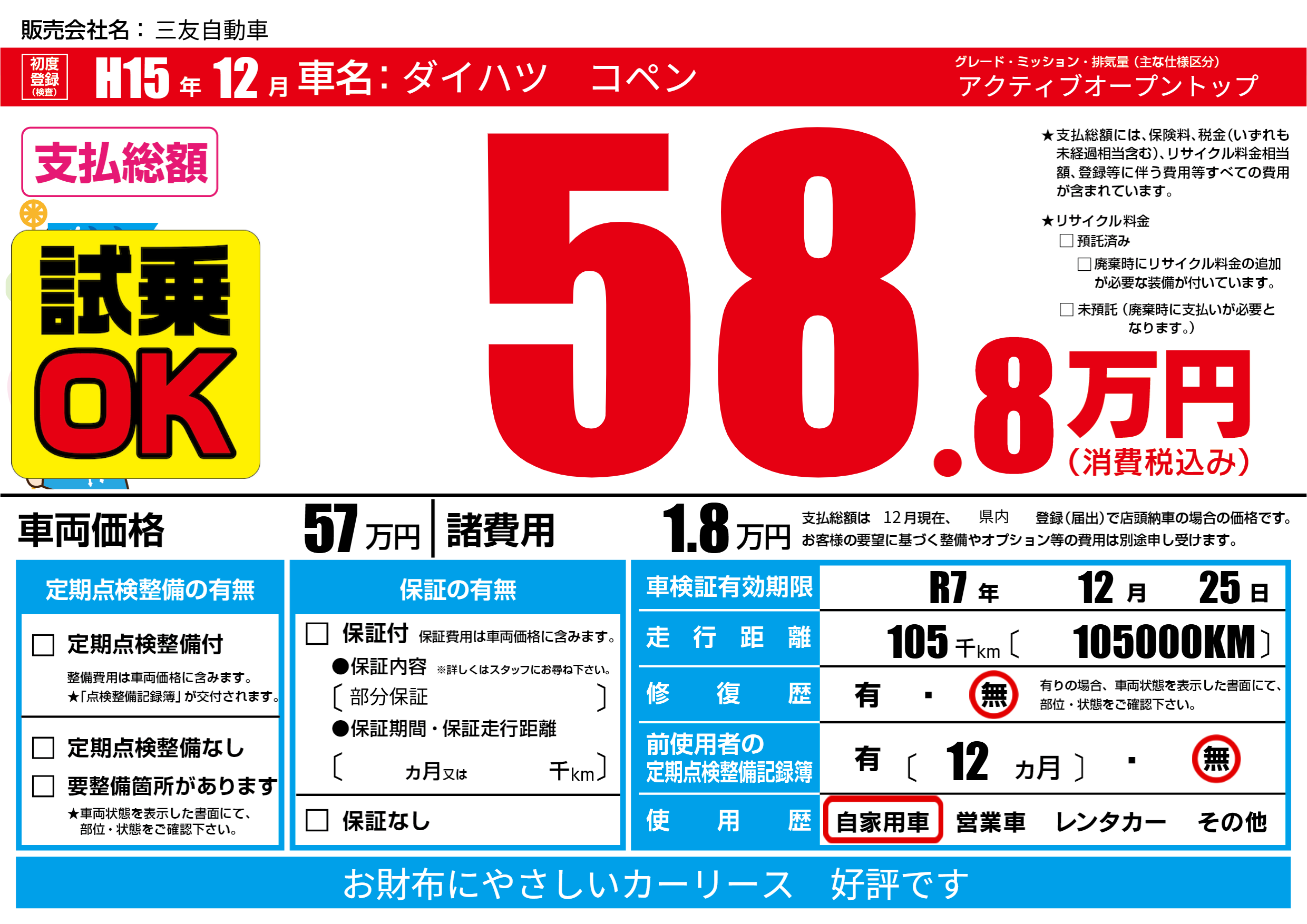 | 車検制限 | R7年 12月 25日 | ||