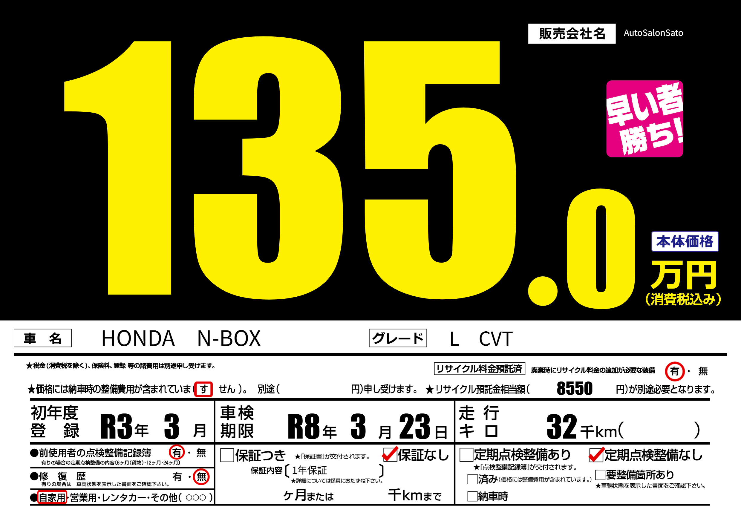 | 車名 | HONDA N-BOX | グレード ミッション 排気量 |