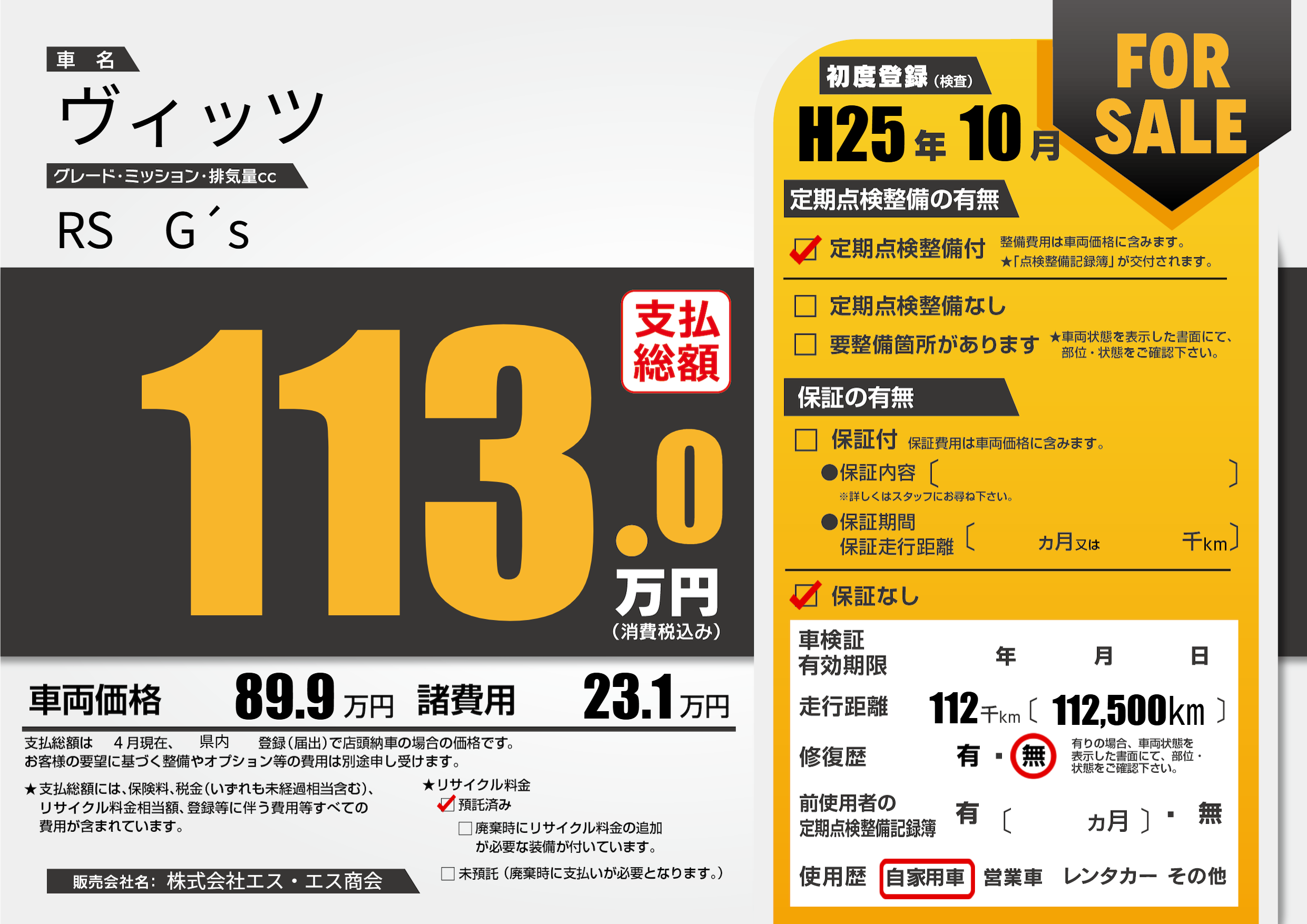 | 走行キロ | 11.2万km | 初年度登録 | H25年10月 |