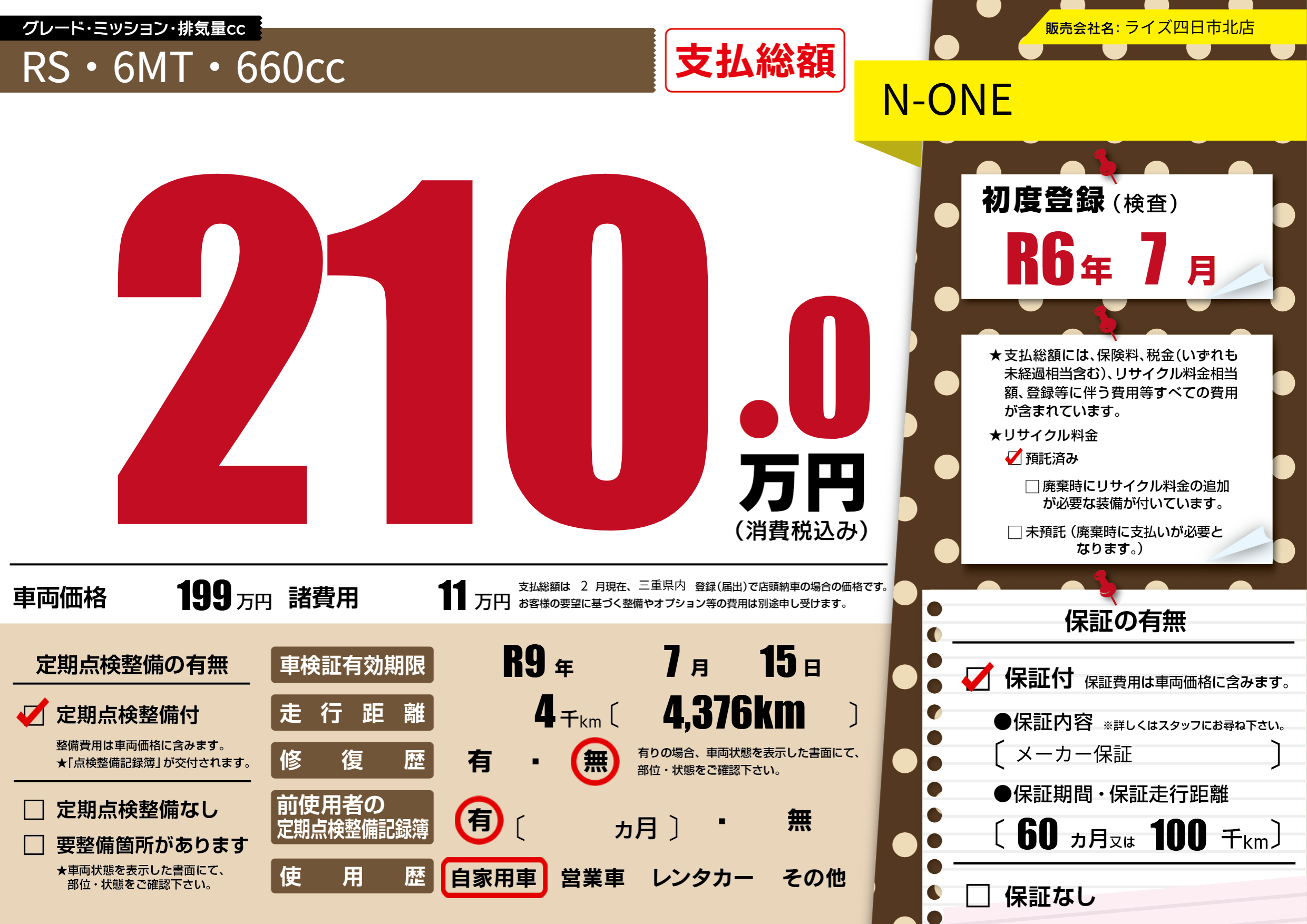 なし | 車検制限 | R9年7月15月 |