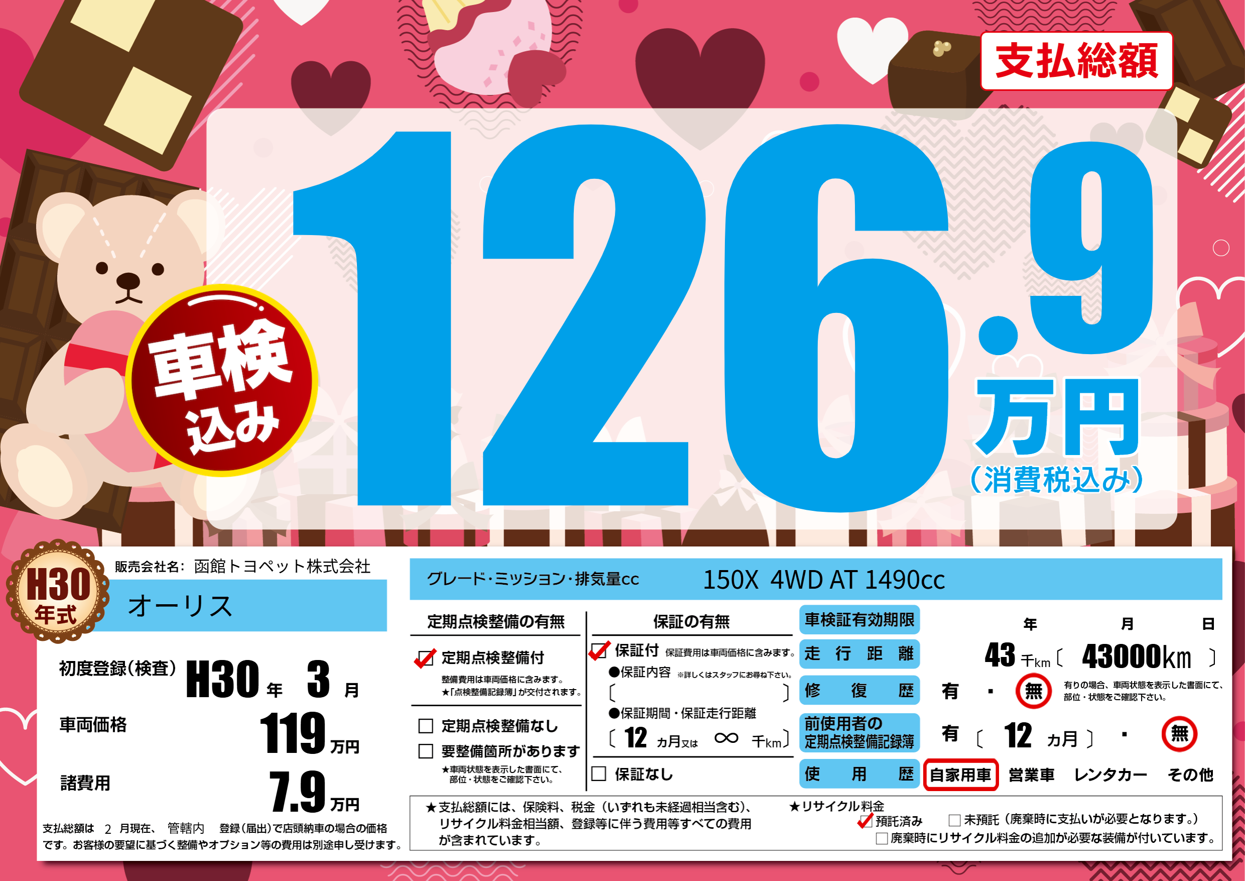 | 走行キロ | 4.3万km | 初年度登録 | H30年3月 |