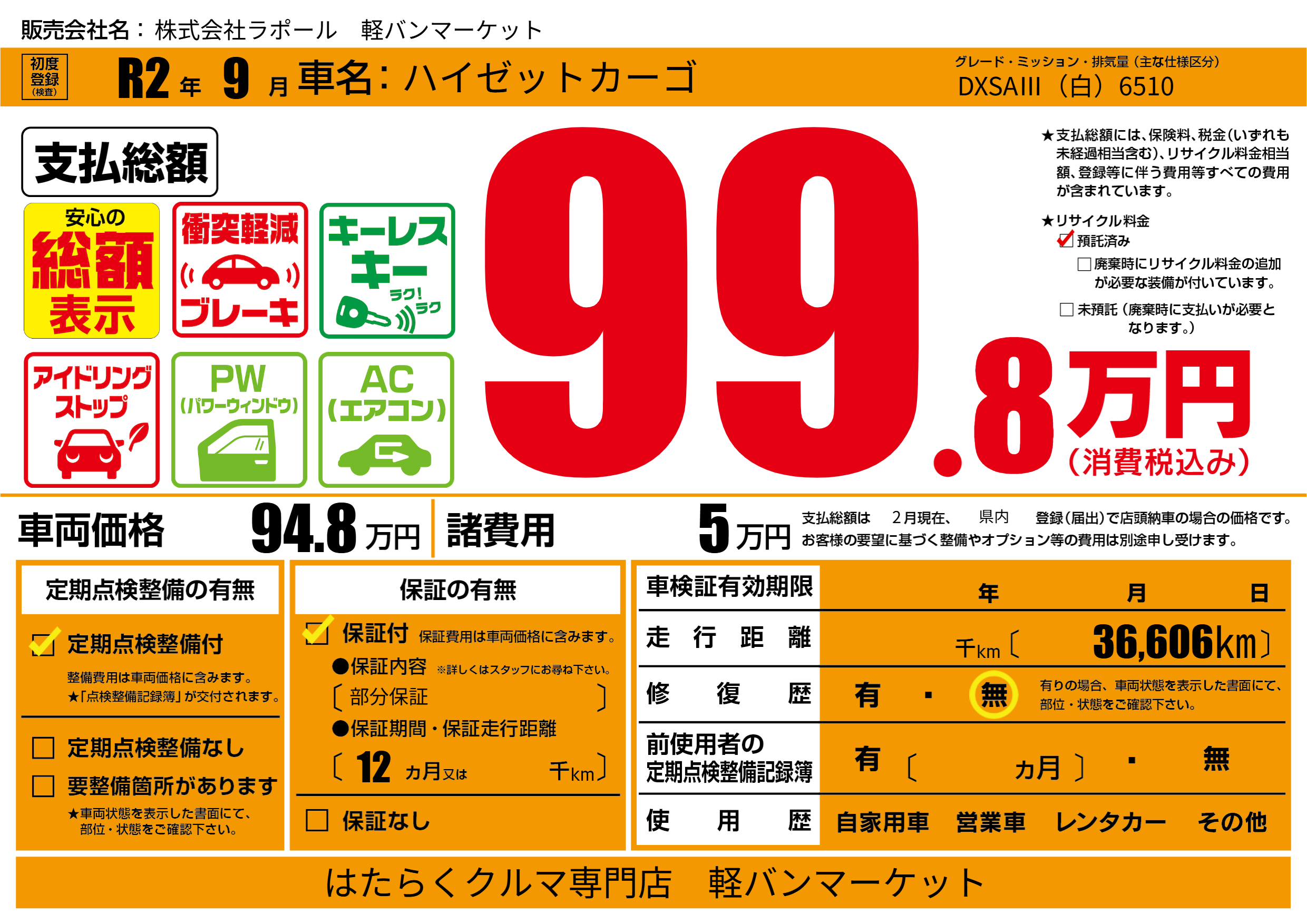 保証付き 保証内容(部分保証) 12ヶ月または()千kmまで |