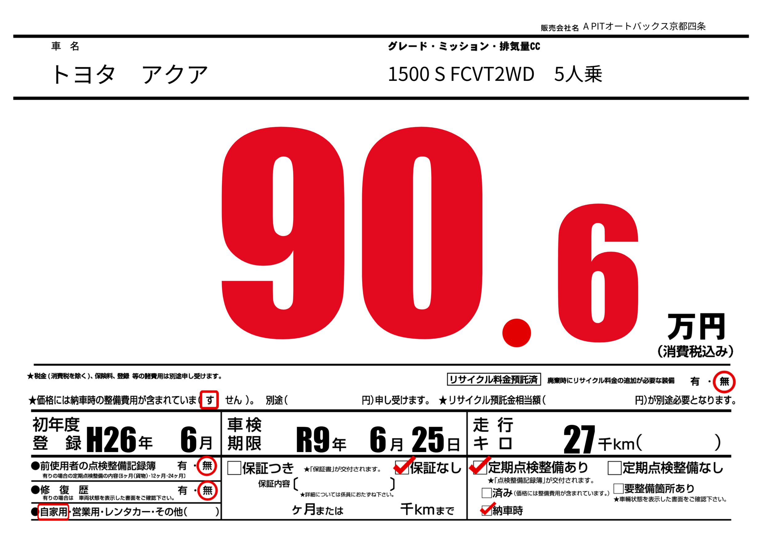 | 定期点検整備 | 定期点検整備あり 納車時あり | ||