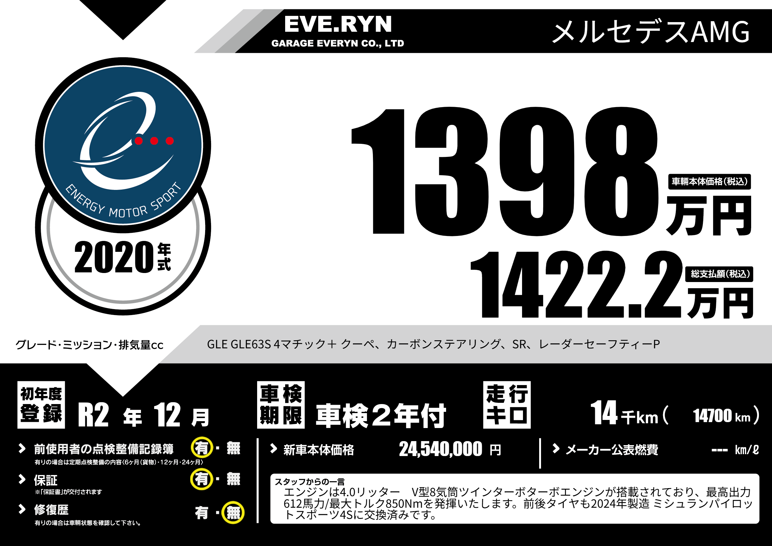 | 車名 | メルセデスAMG | グレード ミッション 排気量 |