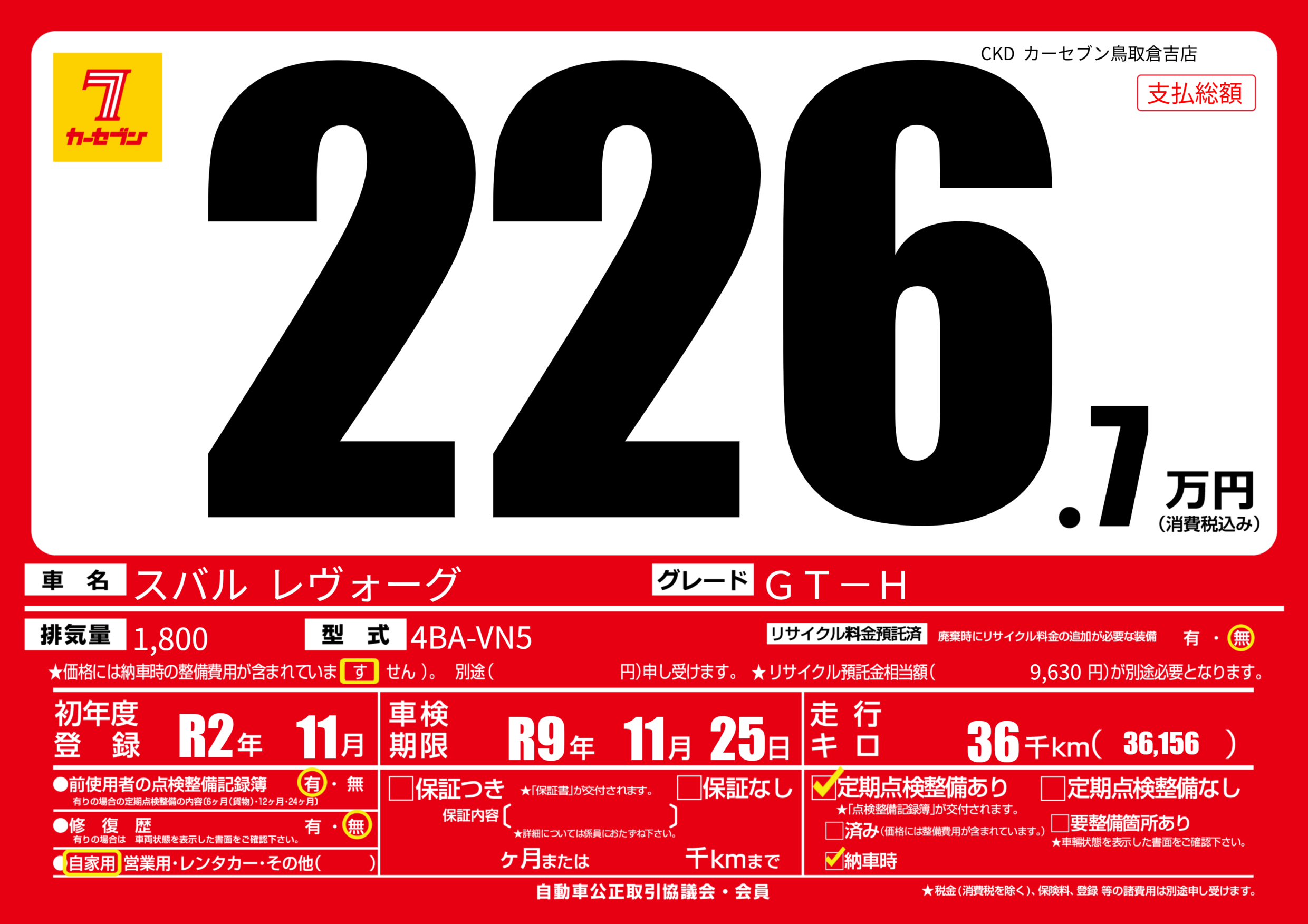 | 車名 | スバル レヴォーグ | グレード ミッション 排気量 |