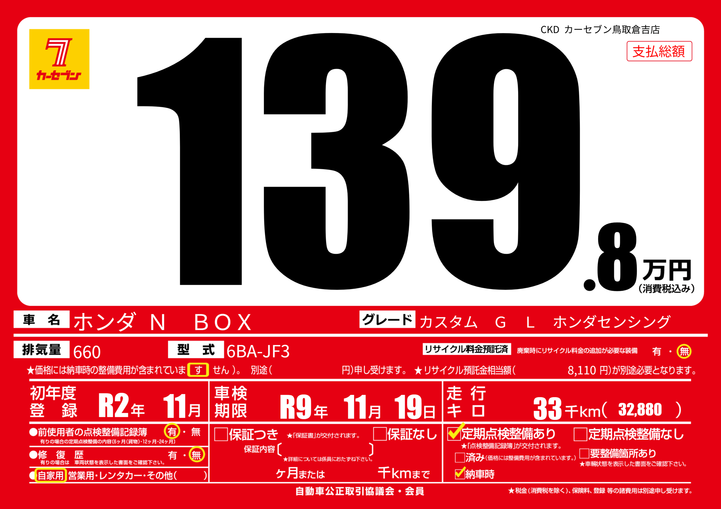 | 車検制限 | R9年 11月 19日 | ||