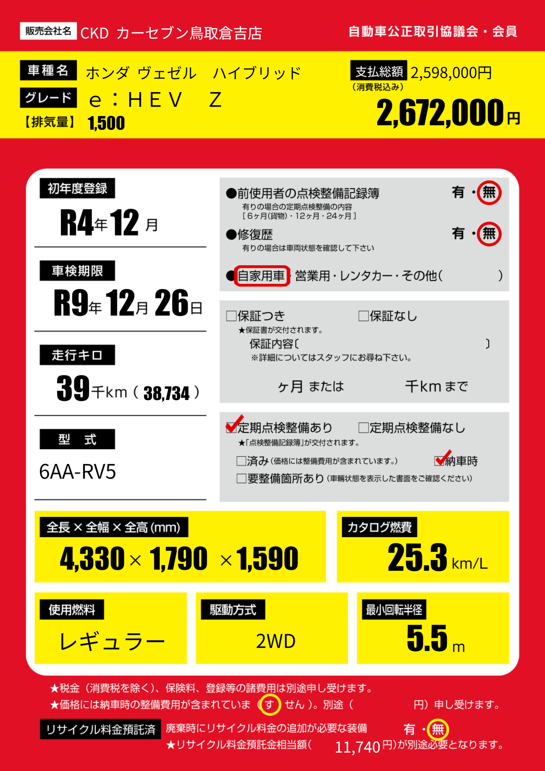 | 車名 | ホンダ ヴェゼル ハイブリッド | グレード ミッション 排気量 |