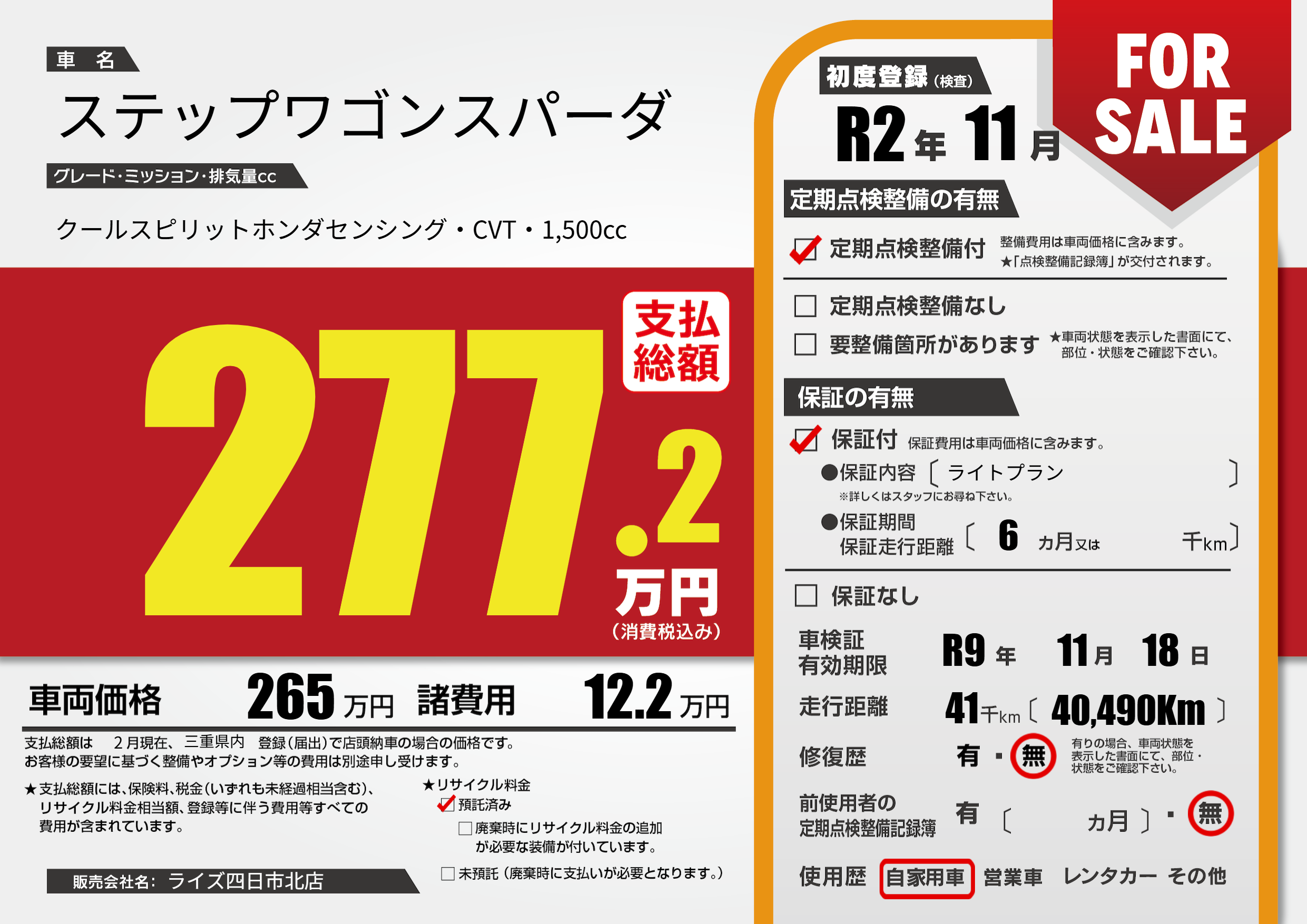| 車名 | ステップワゴンスパーダ | グレード ミッション 排気量 |