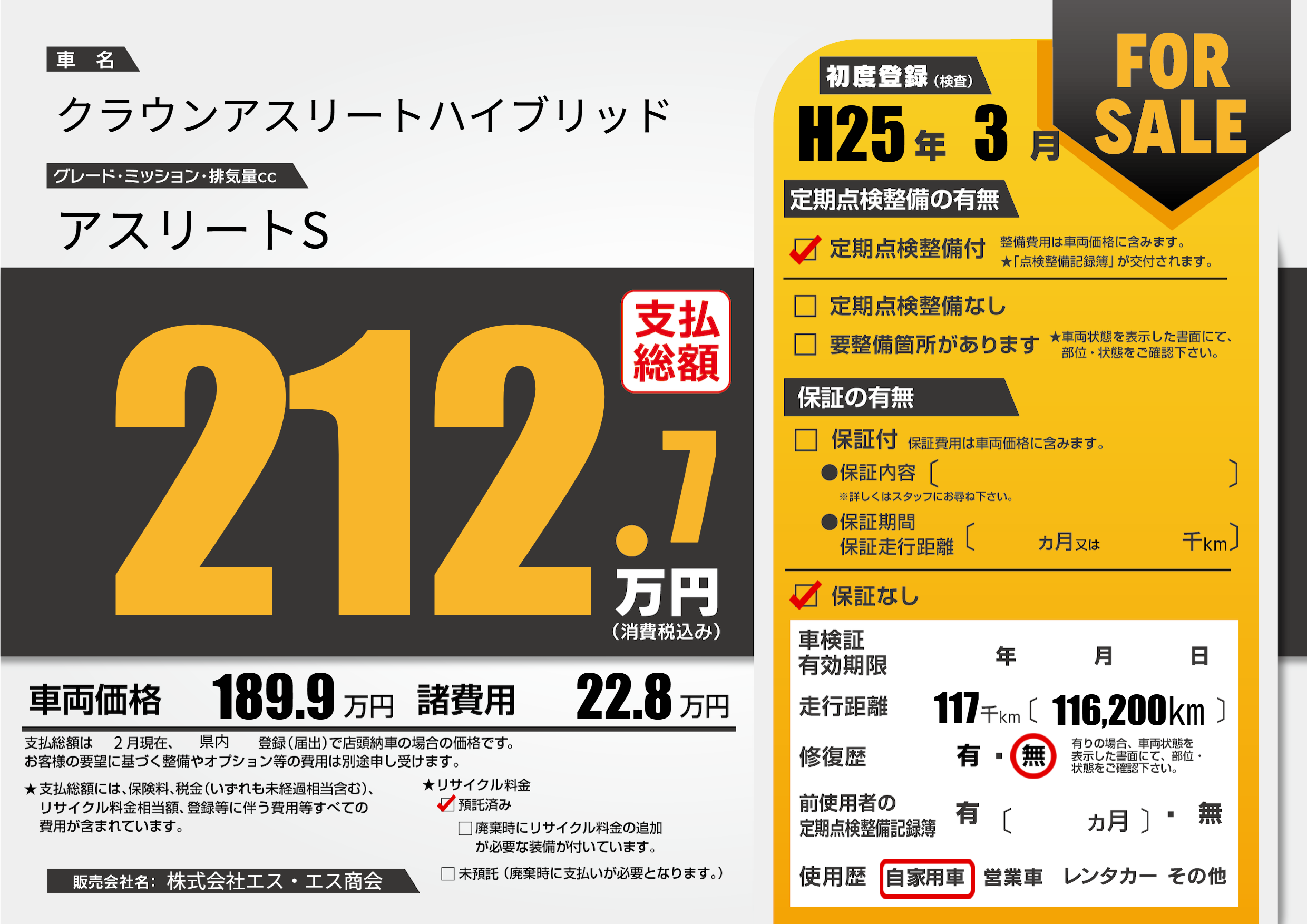| 走行キロ | 11.7万km | 初年度登録 | H25年3月 |