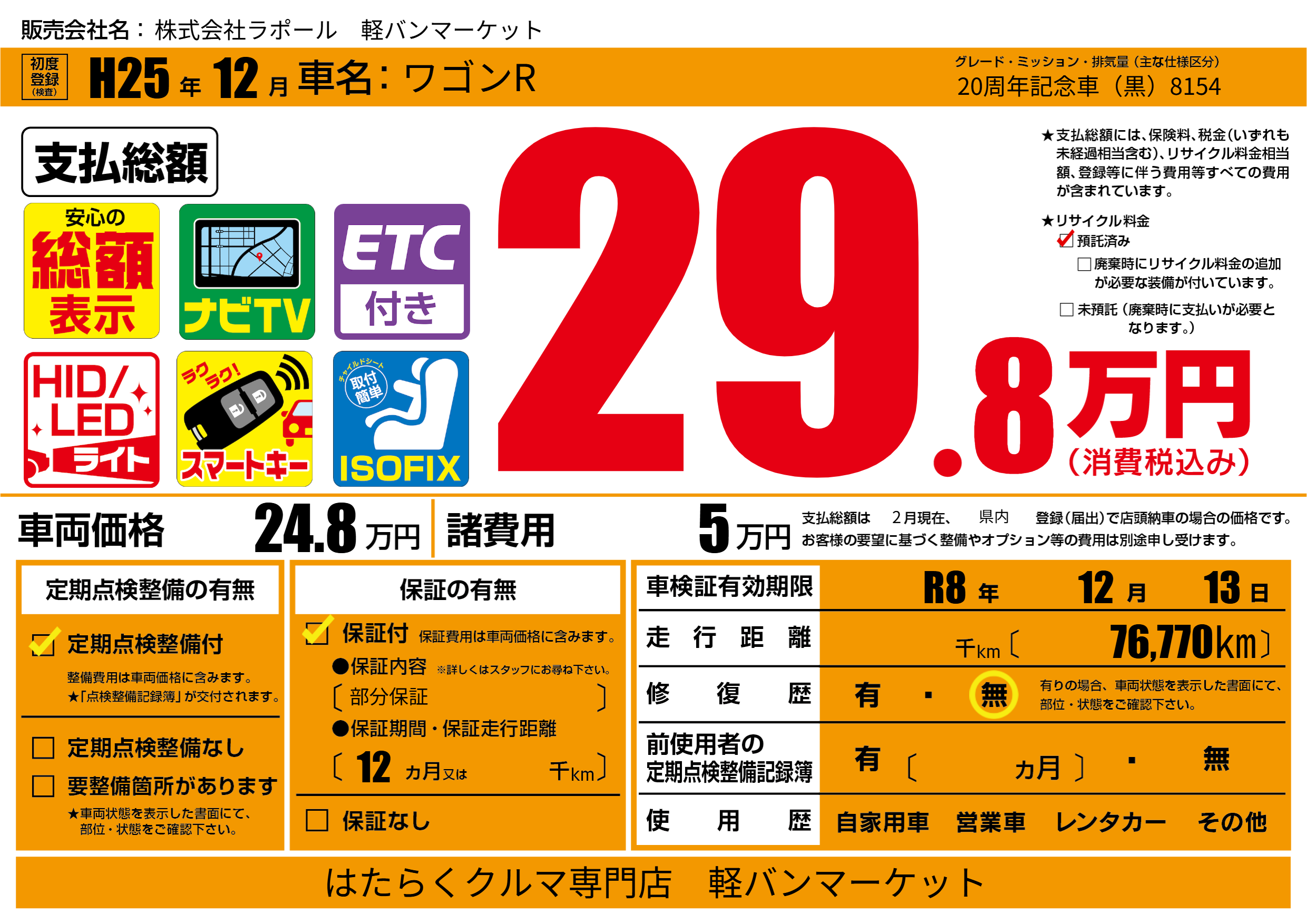 | 車名 | ワゴンR | グレード ミッション 排気量 |