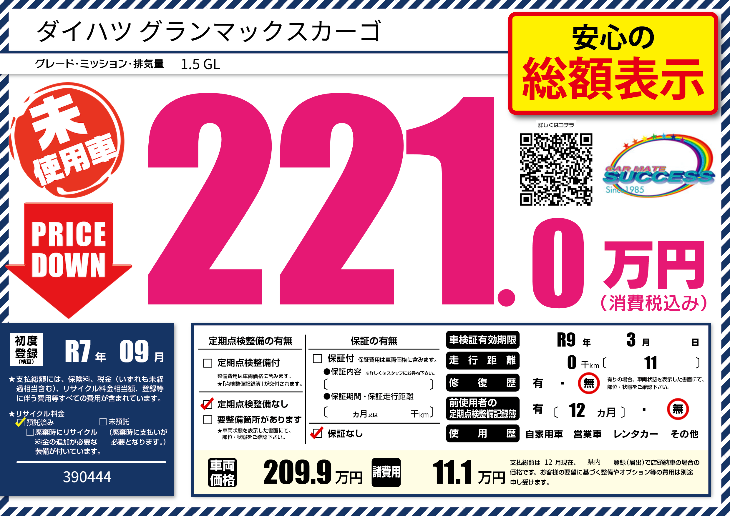 | 走行キロ | - | 初年度登録 | R7年09月 |