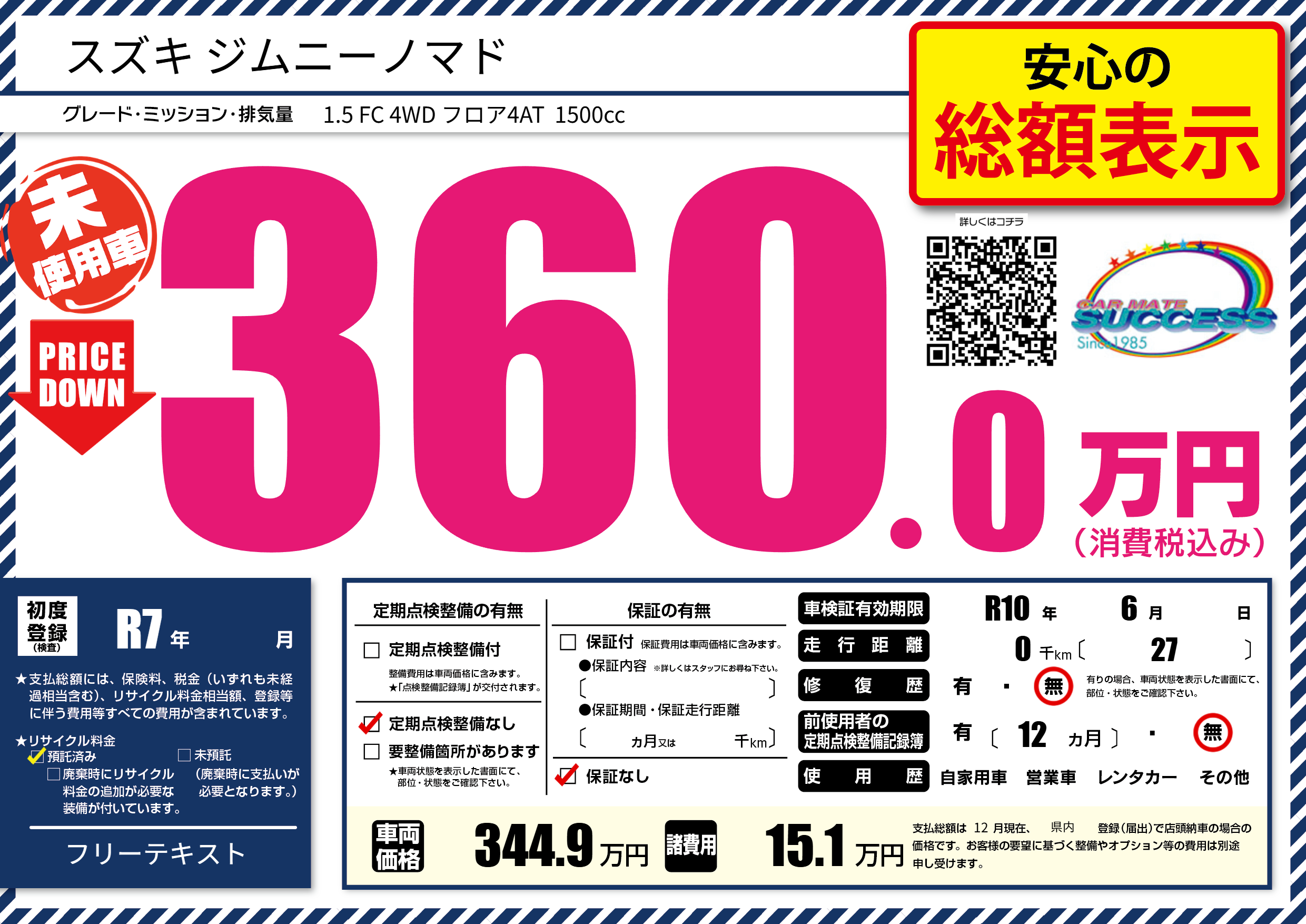 | 車名 | スズキ ジムニーノマド | グレード ミッション 排気量 |