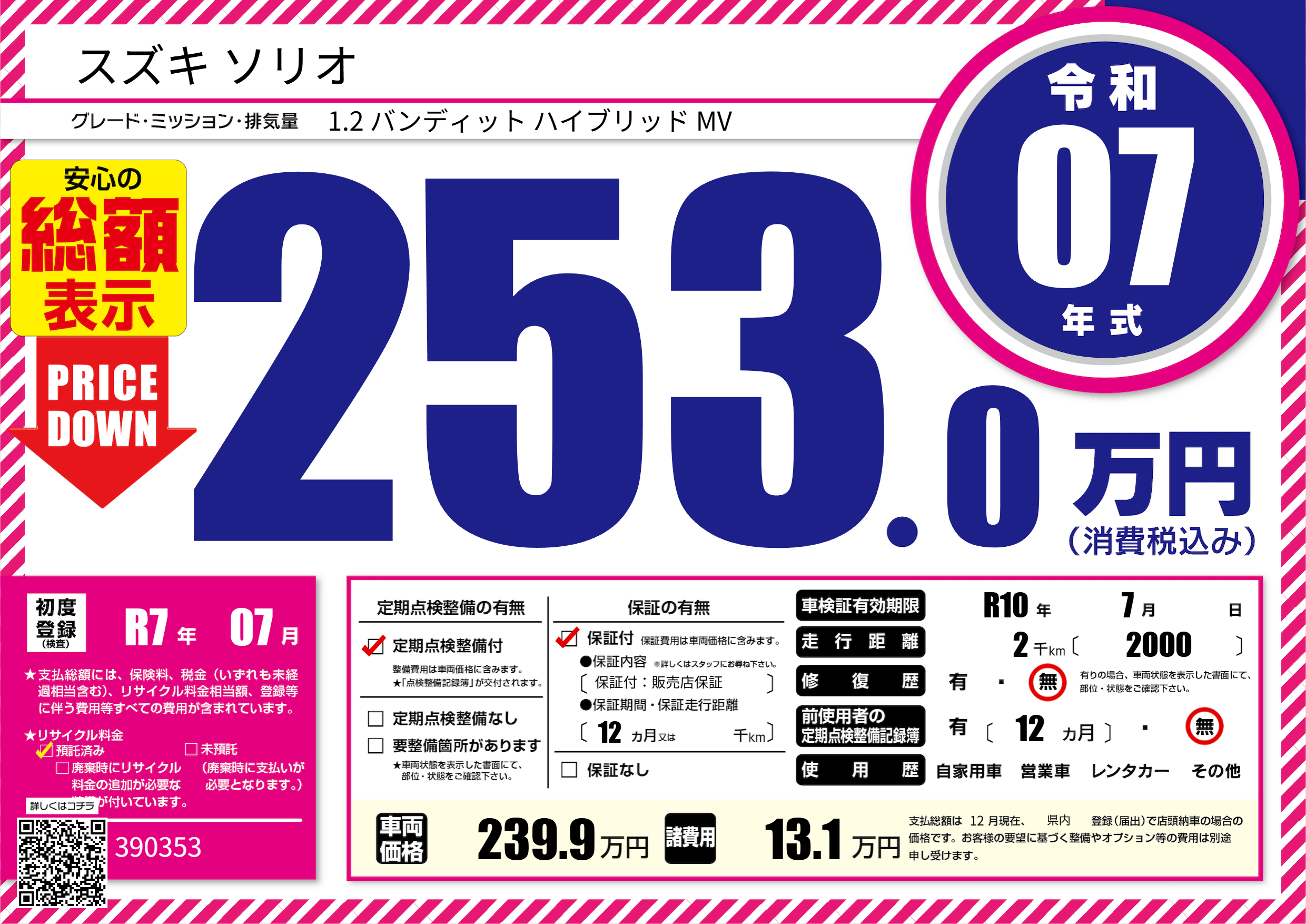 | 走行キロ | 0.2万km | 初年度登録 | R7年07月 |