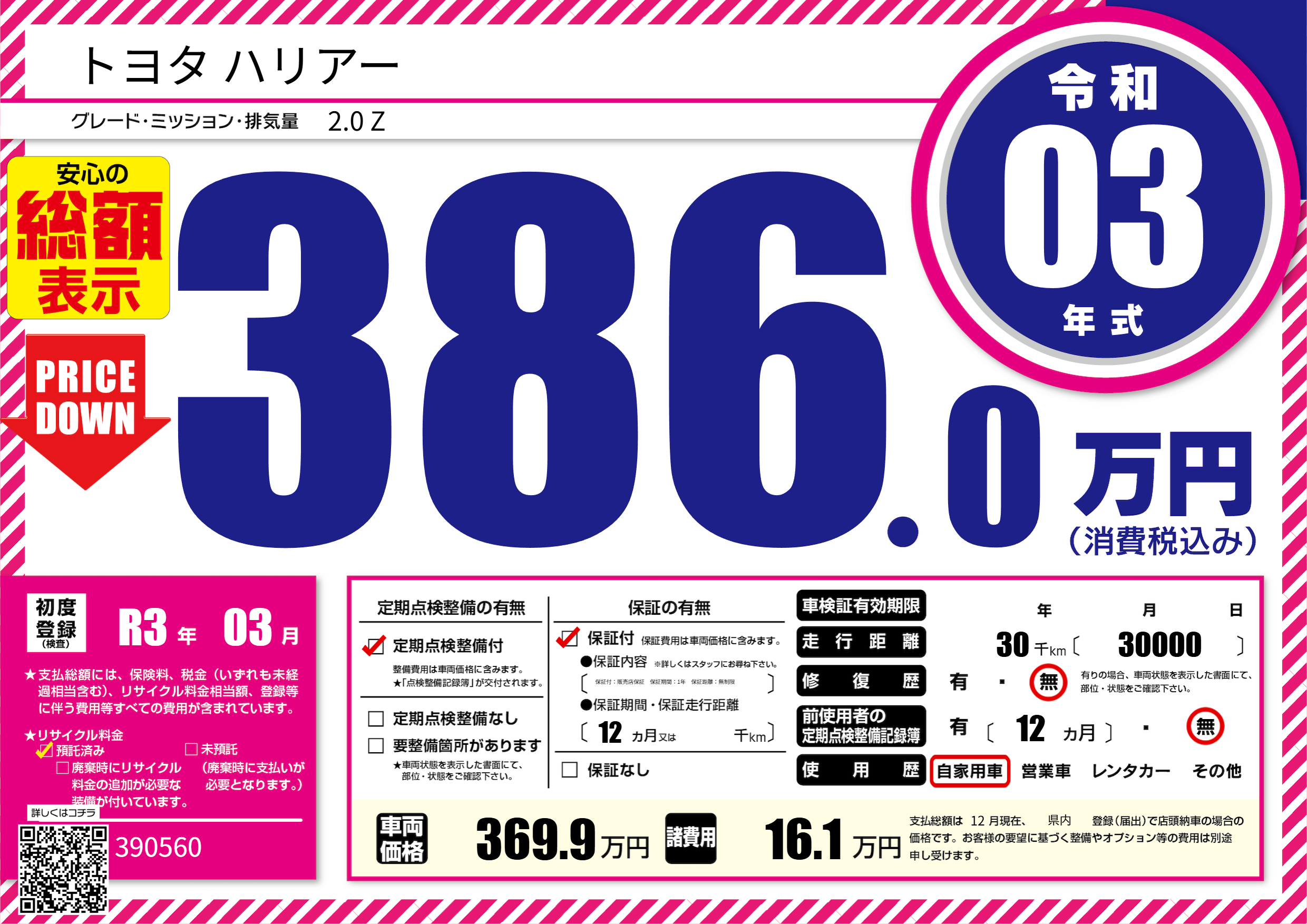 | 走行キロ | 3万km | 初年度登録 | R3年03月 |