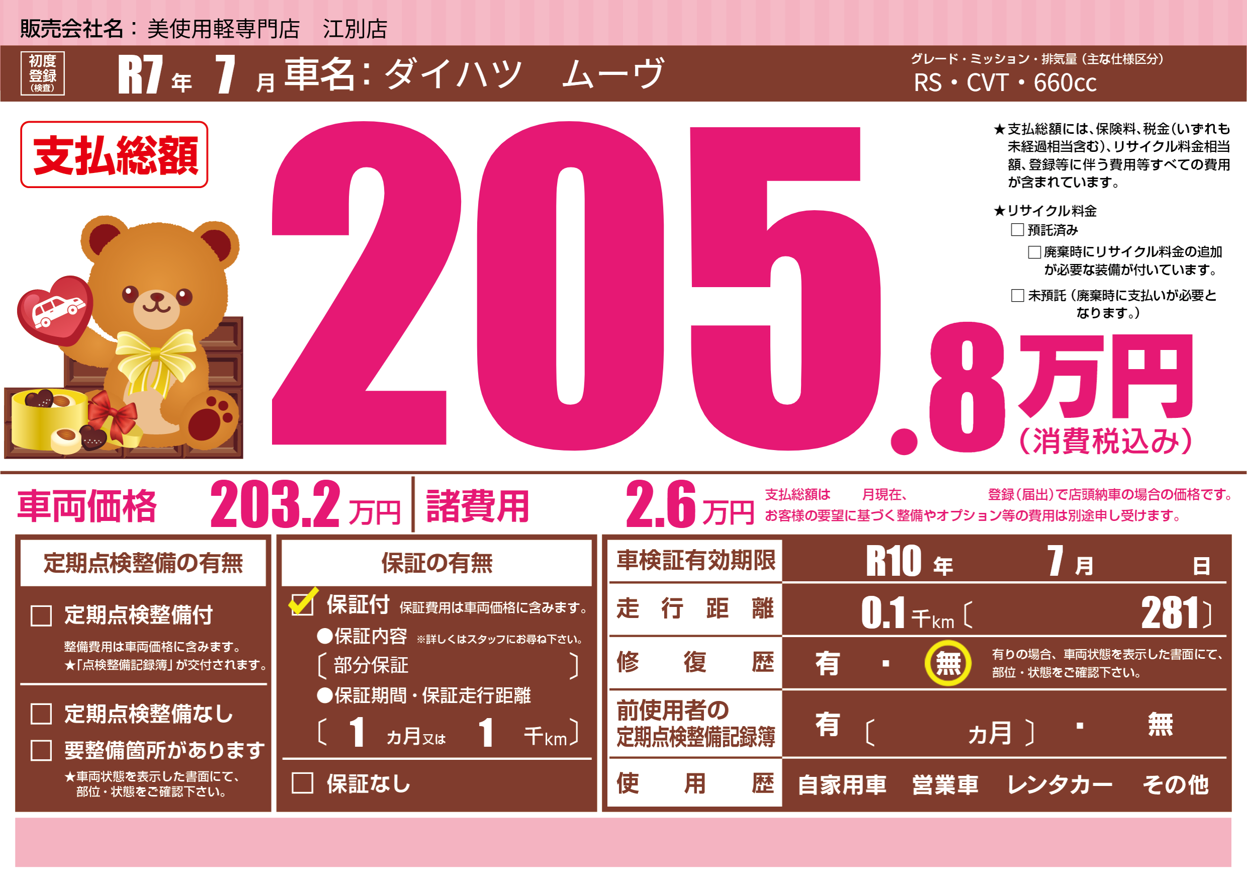 | 走行キロ | - | 初年度登録 | R7年7月 |