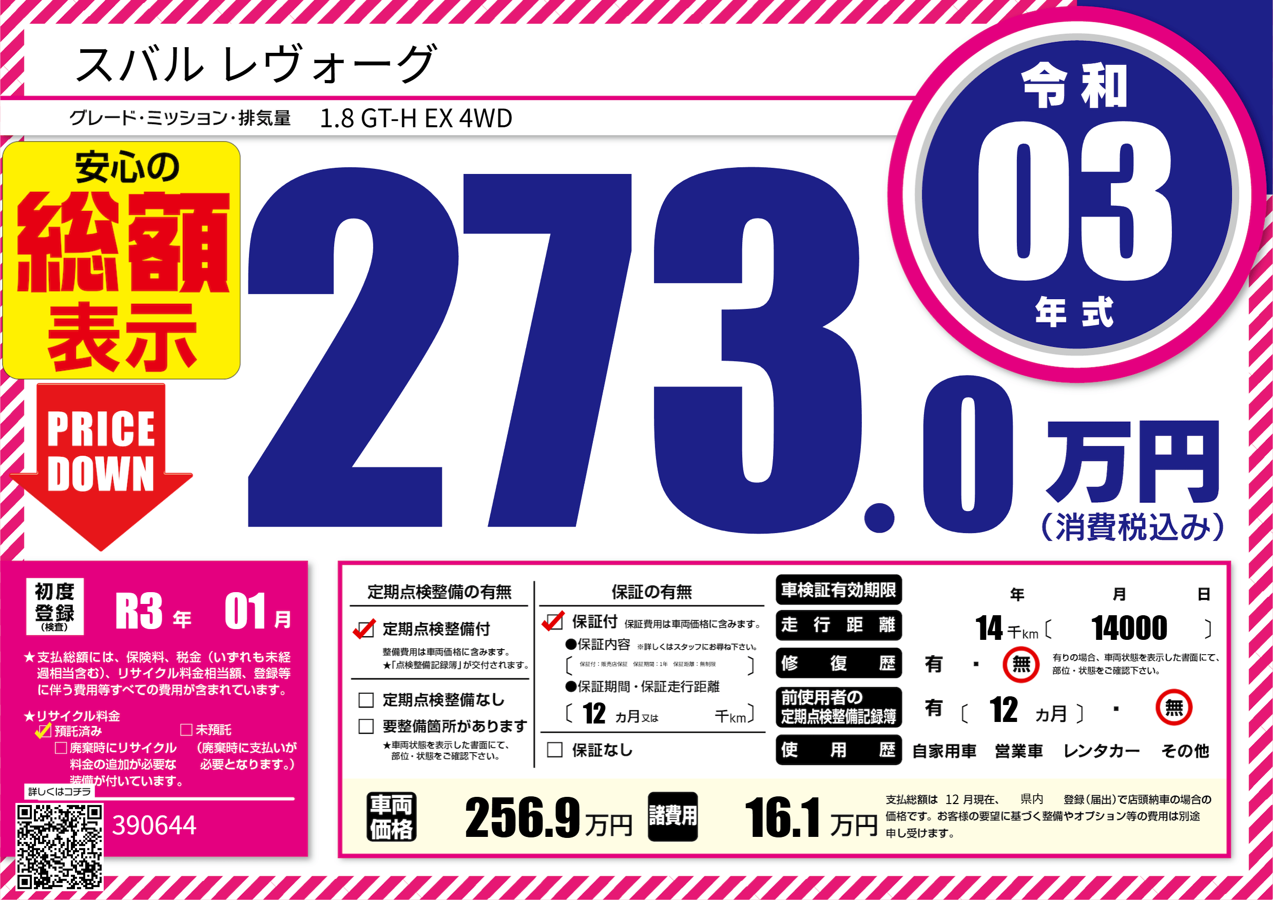 | 車名 | スバル レヴォーグ | グレード ミッション 排気量 |