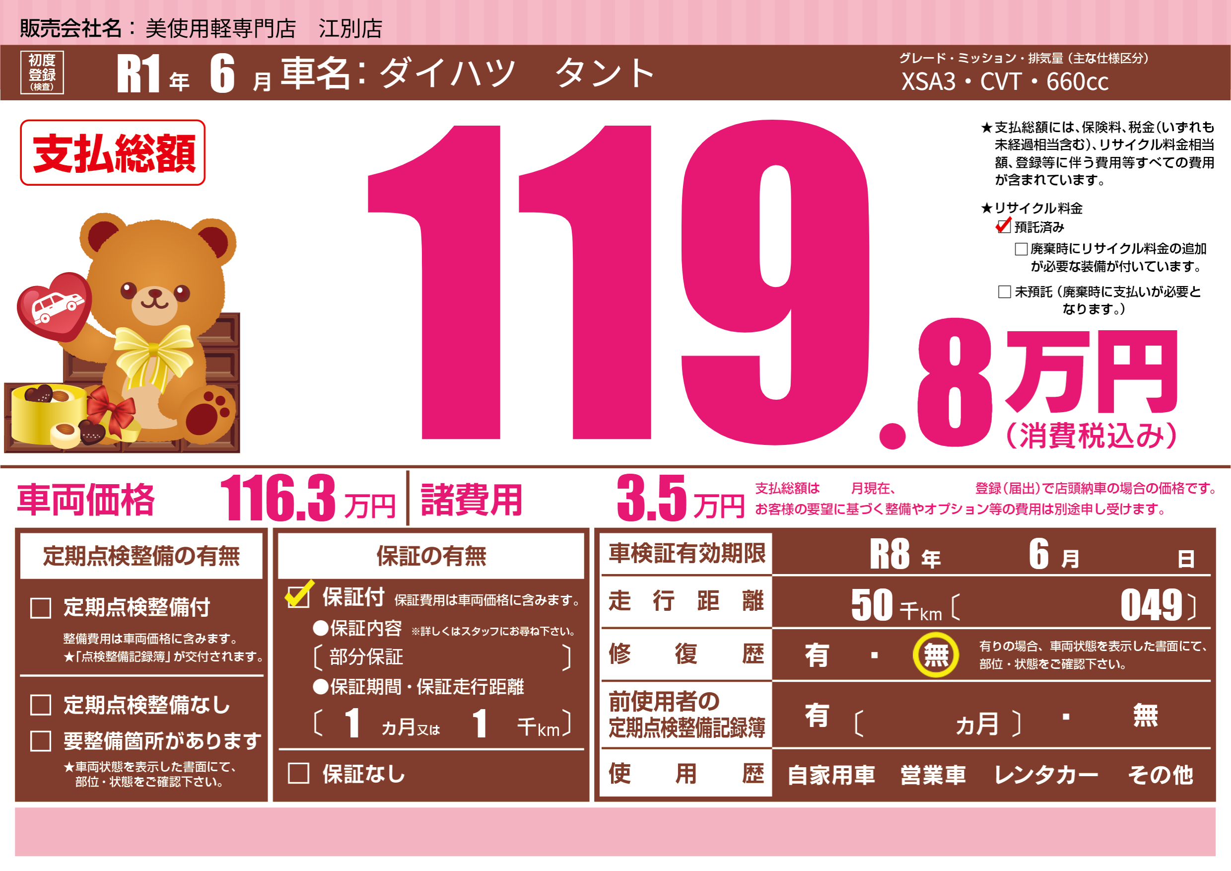 | 車名 | ダイハツ タント | グレード ミッション 排気量 |