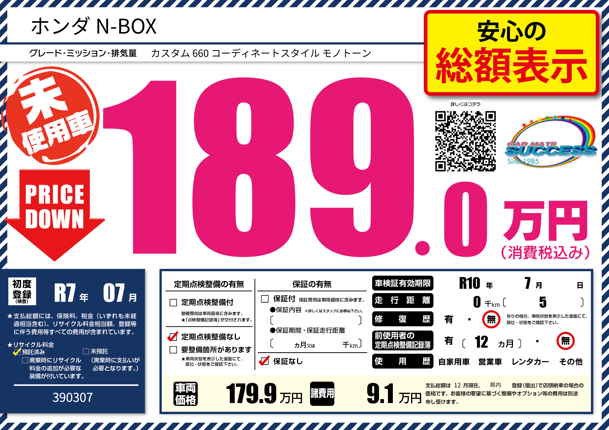 | 走行キロ | - | 初年度登録 | R7年07月 |