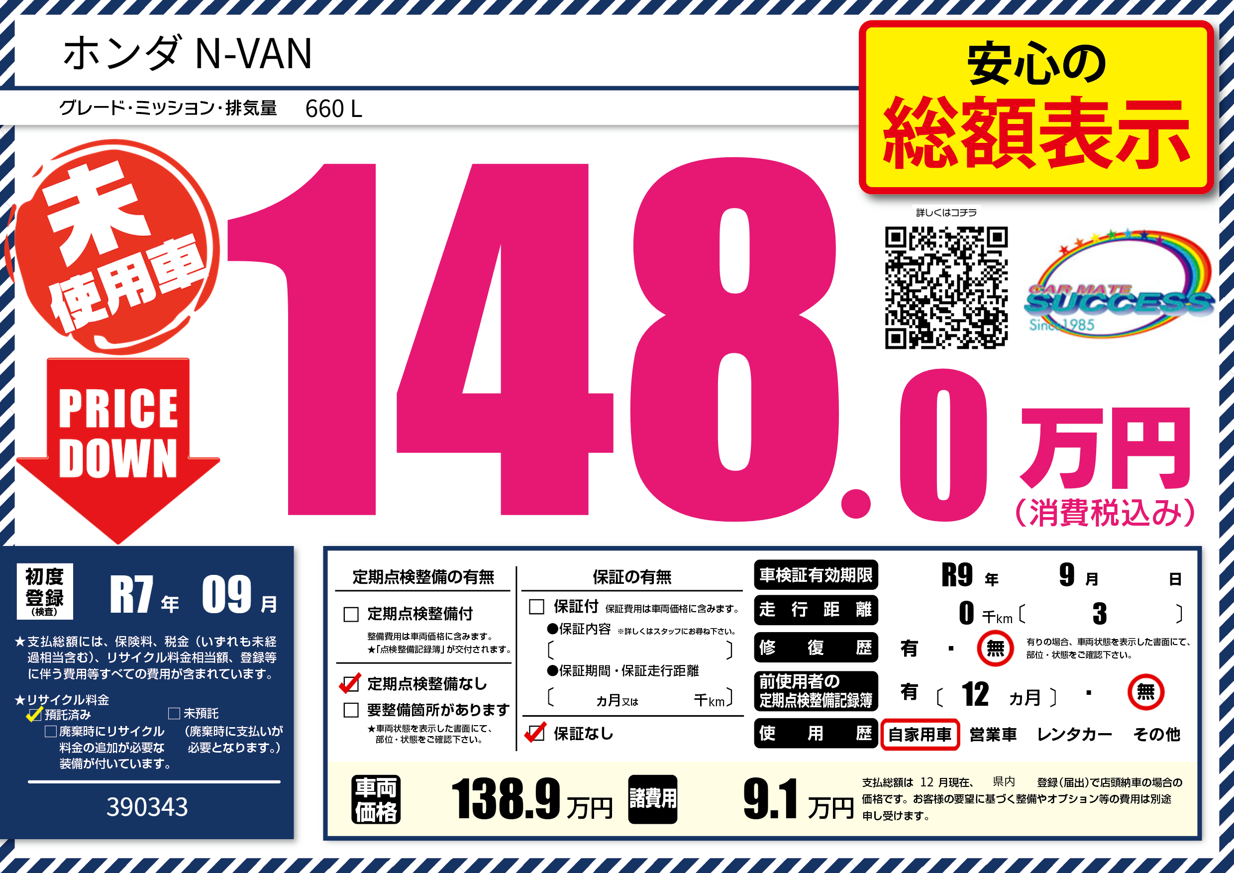 | 車名 | ホンダ N-VAN | グレード ミッション 排気量 |