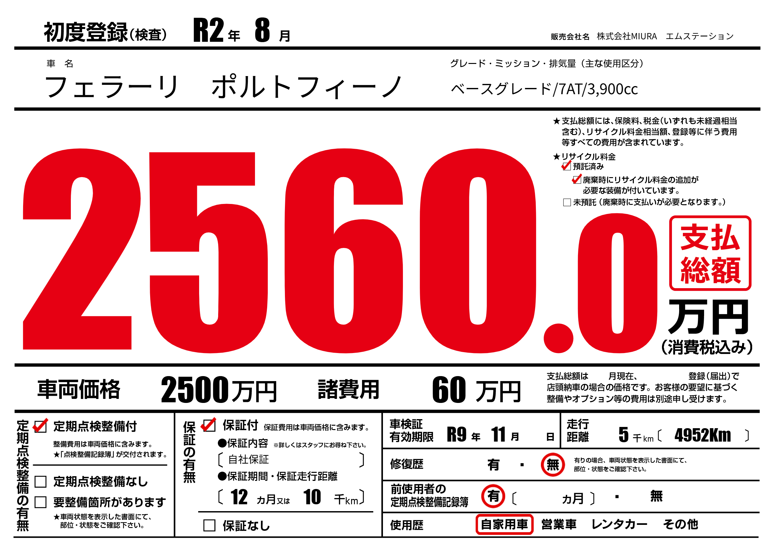 | 車名 | フェラーリ ポルトフィーノ | グレード ミッション 排気量 |