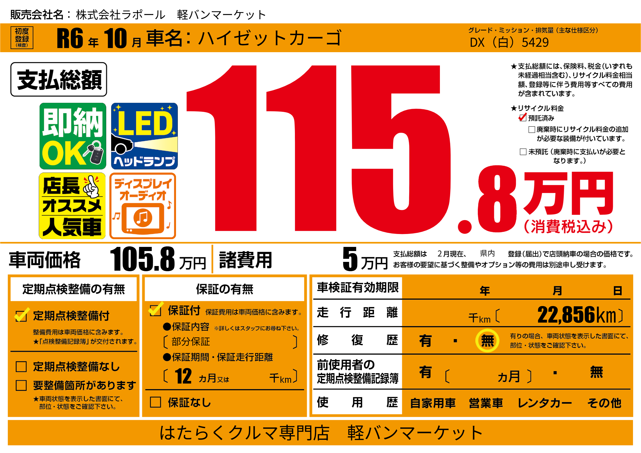 保証付き 保証内容(部分保証) 12ヶ月または()千kmまで |