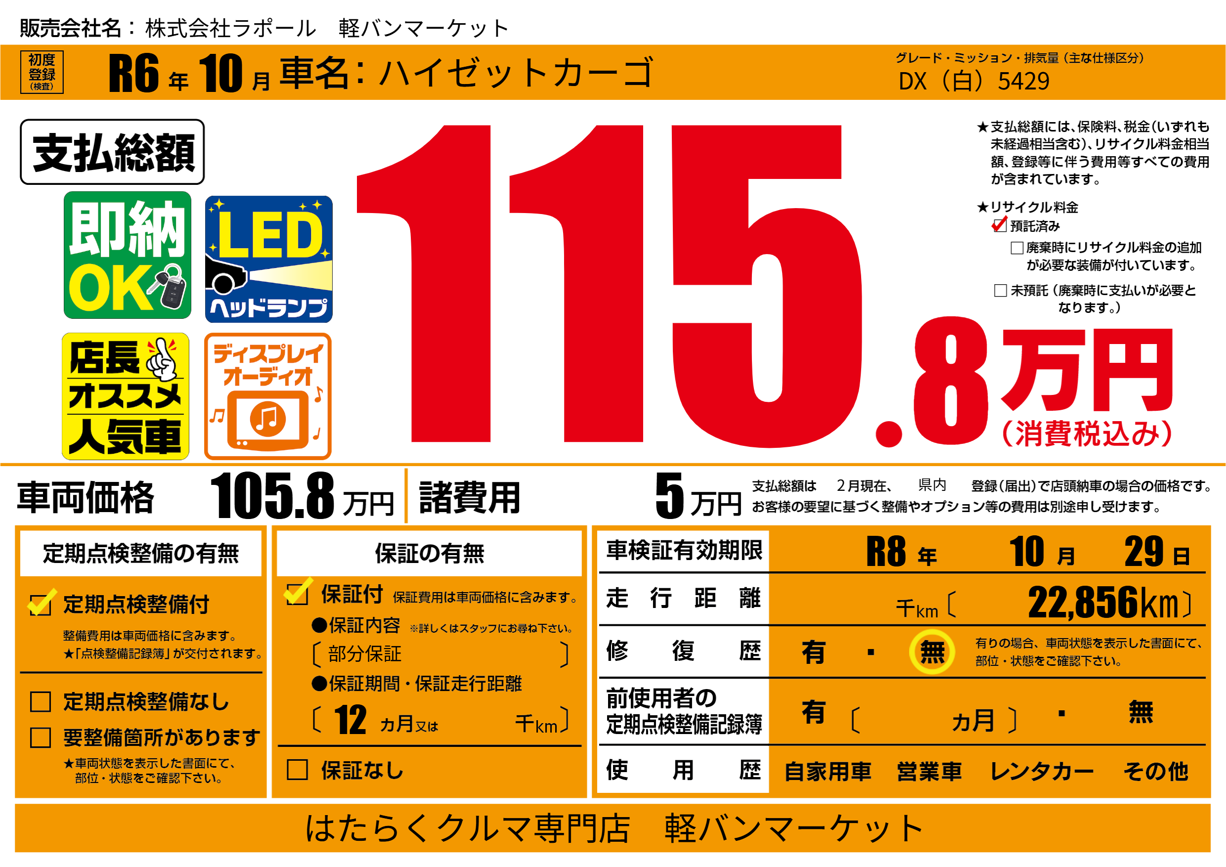 なし | 車検制限 | R8年10月29月 |
