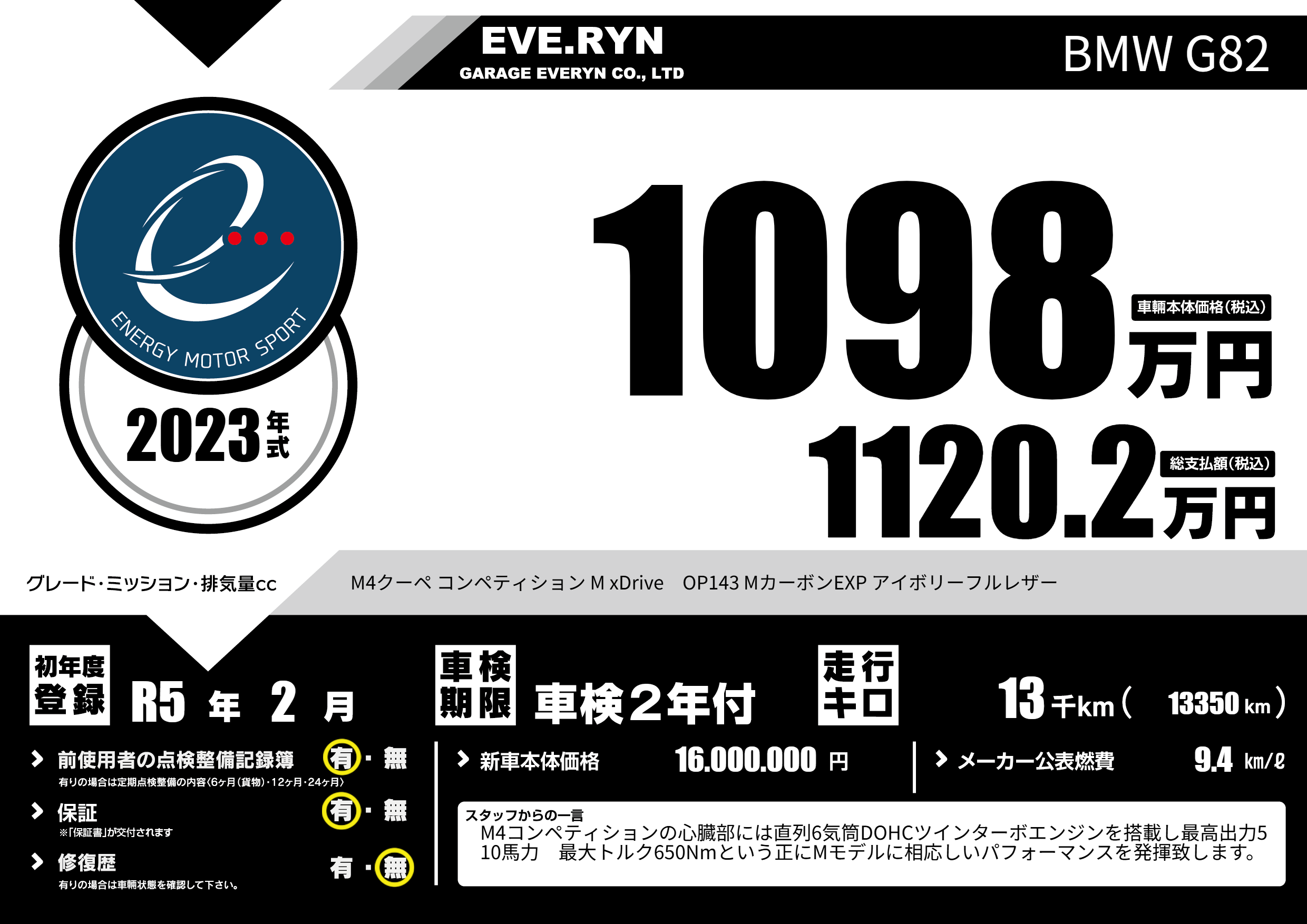 | 車名 | BMW G82 | グレード ミッション 排気量 |
