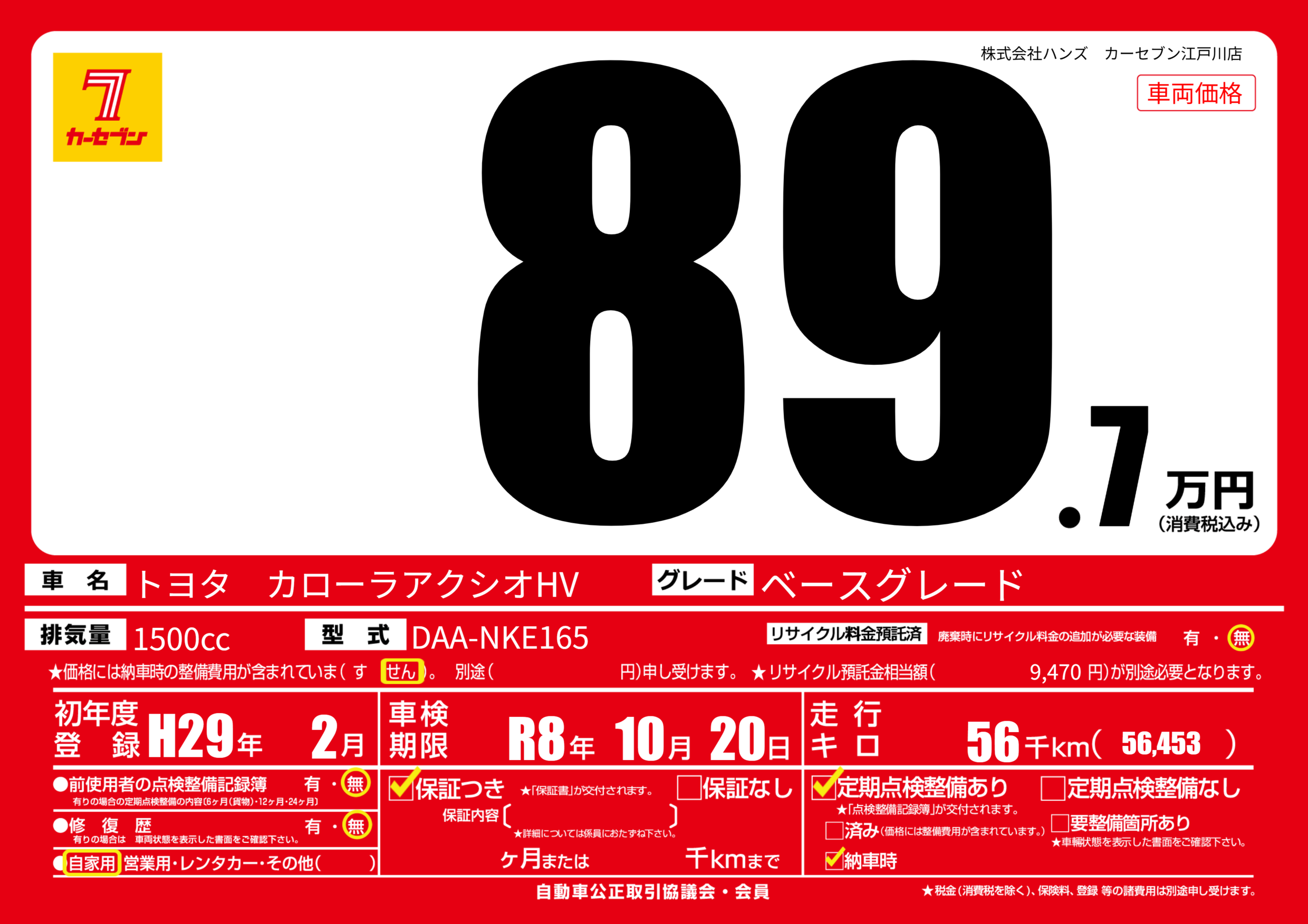 | 定期点検整備 | 定期点検整備あり 納車時あり | ||